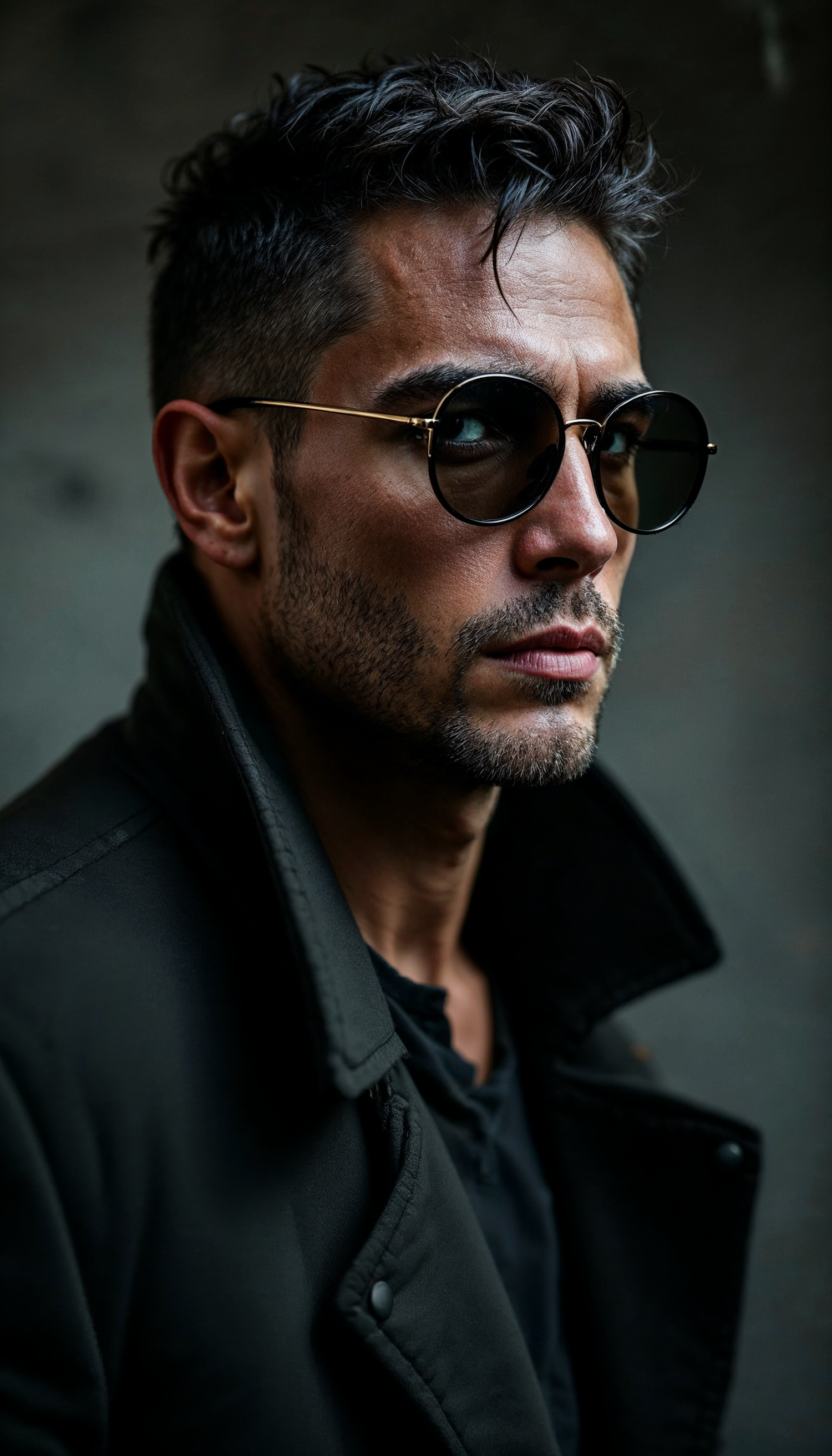 Rugged man with sunglasses and stubble beard in a dark coat, exuding mystery and style. Intense expression and tousled hair.