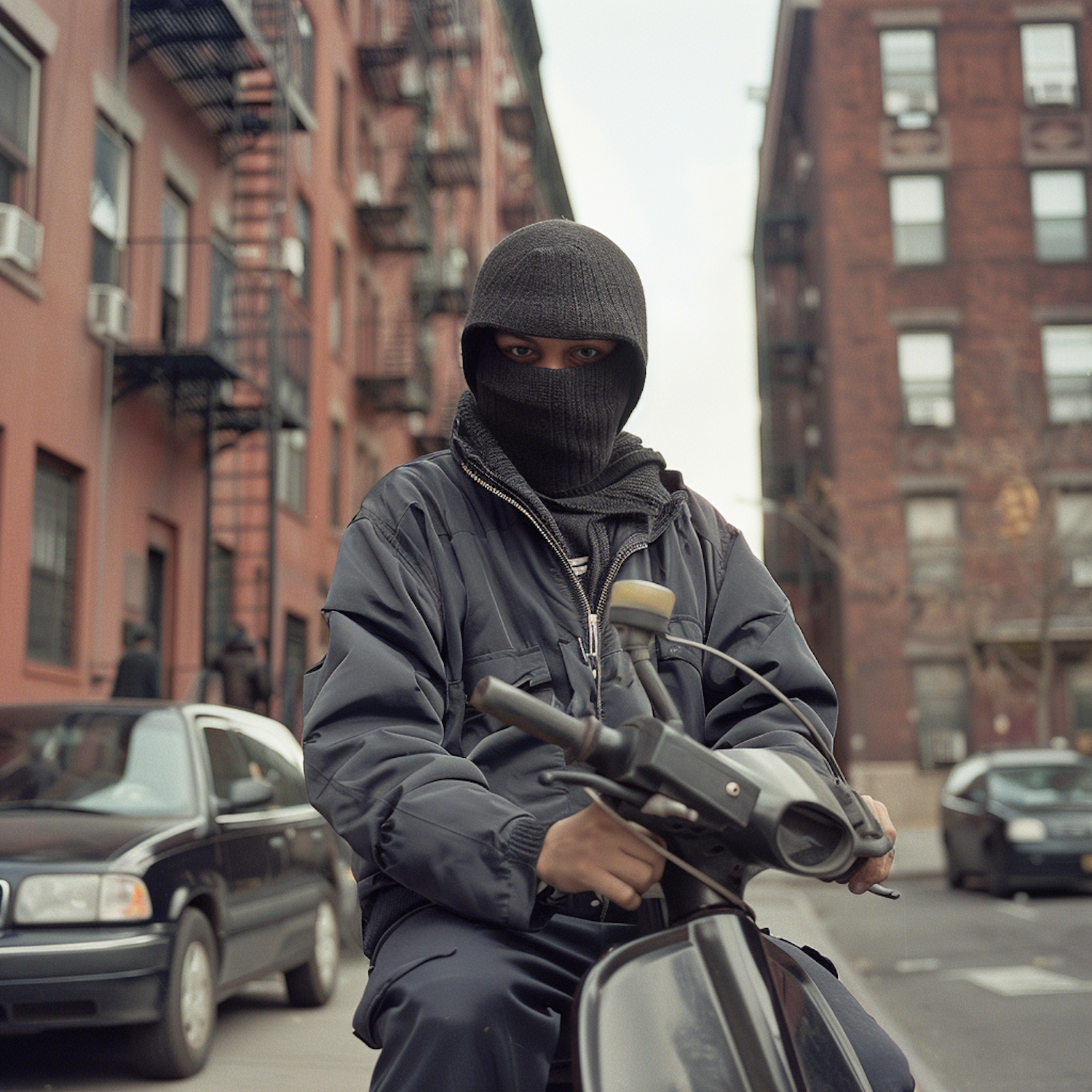 Person in a black balaclava on a scooter in a city street, surrounded by brick buildings and parked cars.