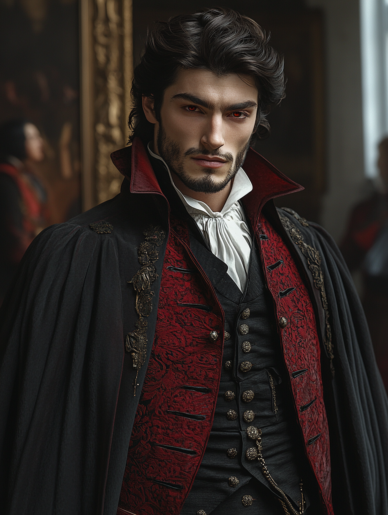 Mysterious man with red eyes in historical attire, exuding a gothic and supernatural aura in a dimly lit setting.