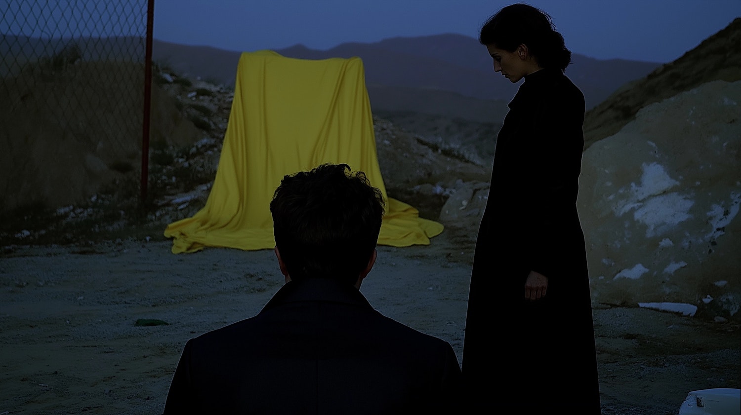A mysterious scene with a yellow cloth-covered object, a man and woman in dark clothing, set against a barren landscape at dusk.