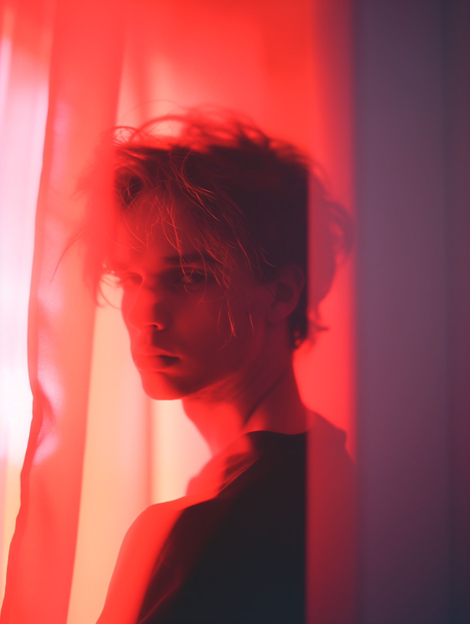 Young man with tousled hair behind a red curtain, creating a dramatic and moody atmosphere with warm lighting.