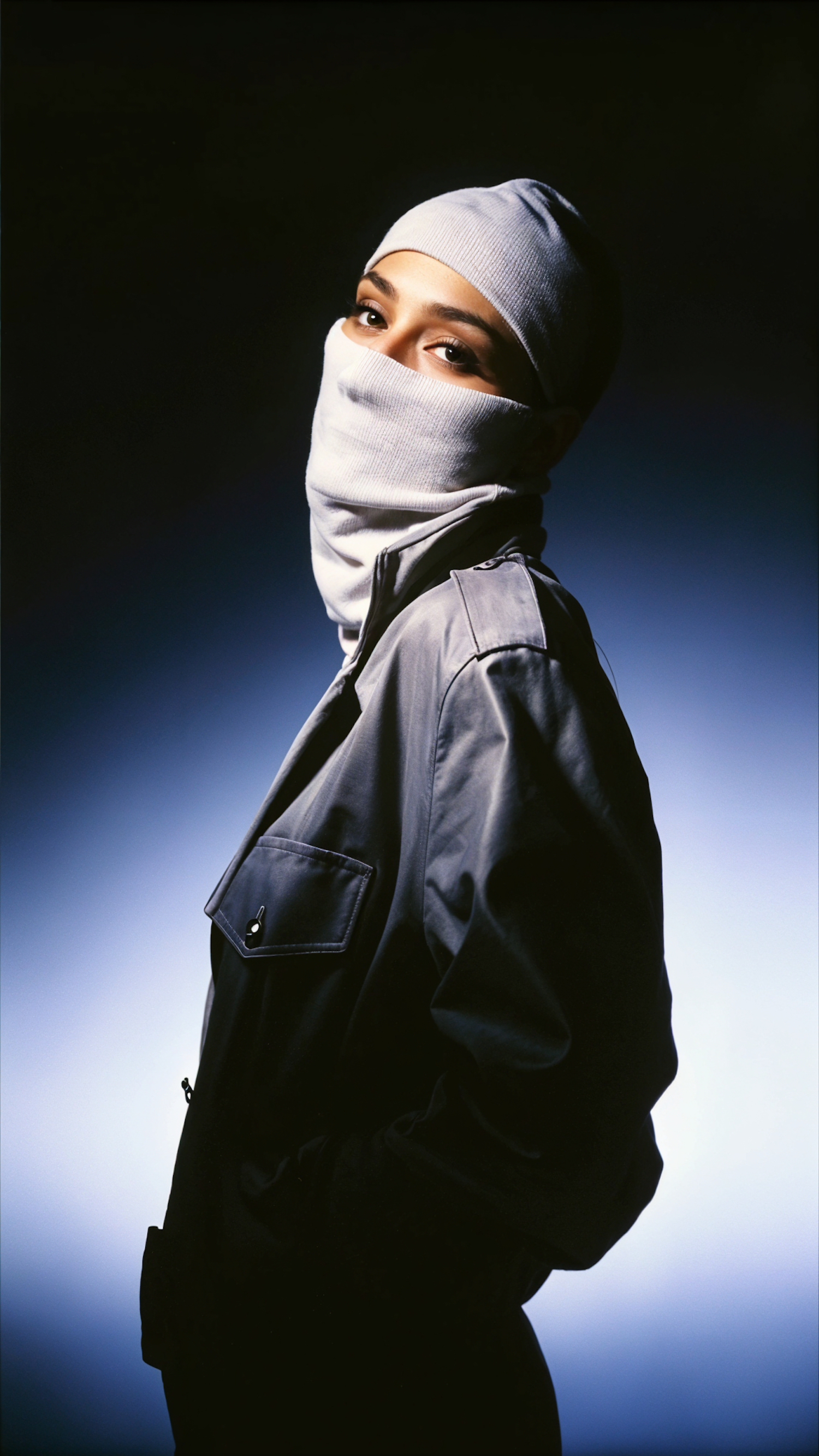 Mysterious figure in gray beanie and jacket against a blue gradient background, with eyes peering intensely.