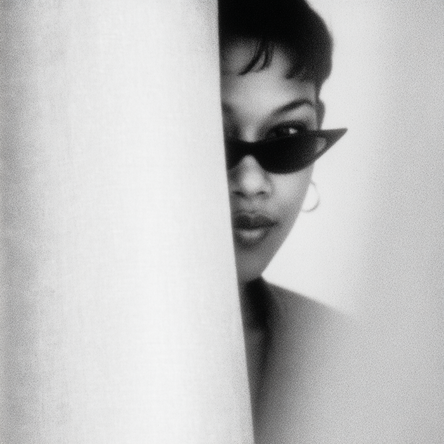 Black-and-white photo of a person in cat-eye sunglasses peeking from behind a curtain, creating a mysterious and artistic vibe.