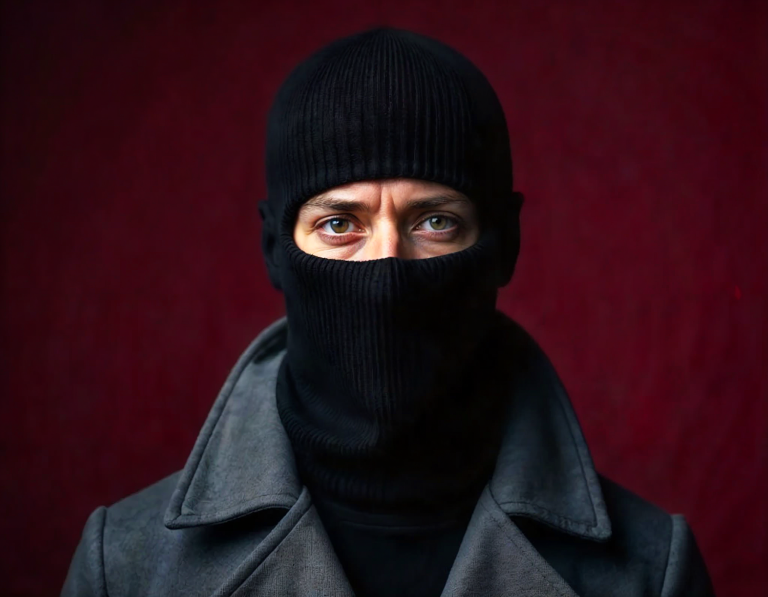 Mysterious figure in a black balaclava and gray coat against a red background, creating an intense and enigmatic atmosphere.