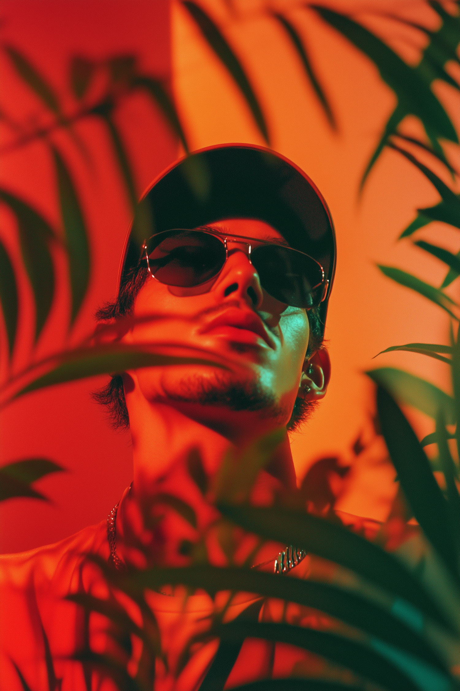 Stylish young man in sunglasses and cap, surrounded by vibrant red and orange hues with lush green leaves in the foreground.