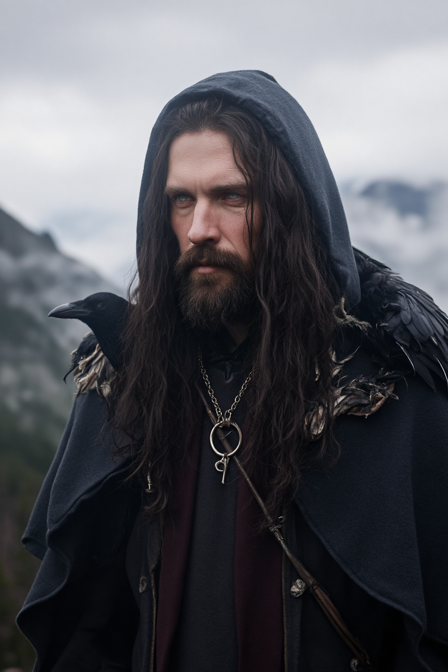 Mysterious man with long hair, a hooded cloak, and a raven on his shoulder in a foggy mountain setting. Intense blue eyes and symbolic pendant.