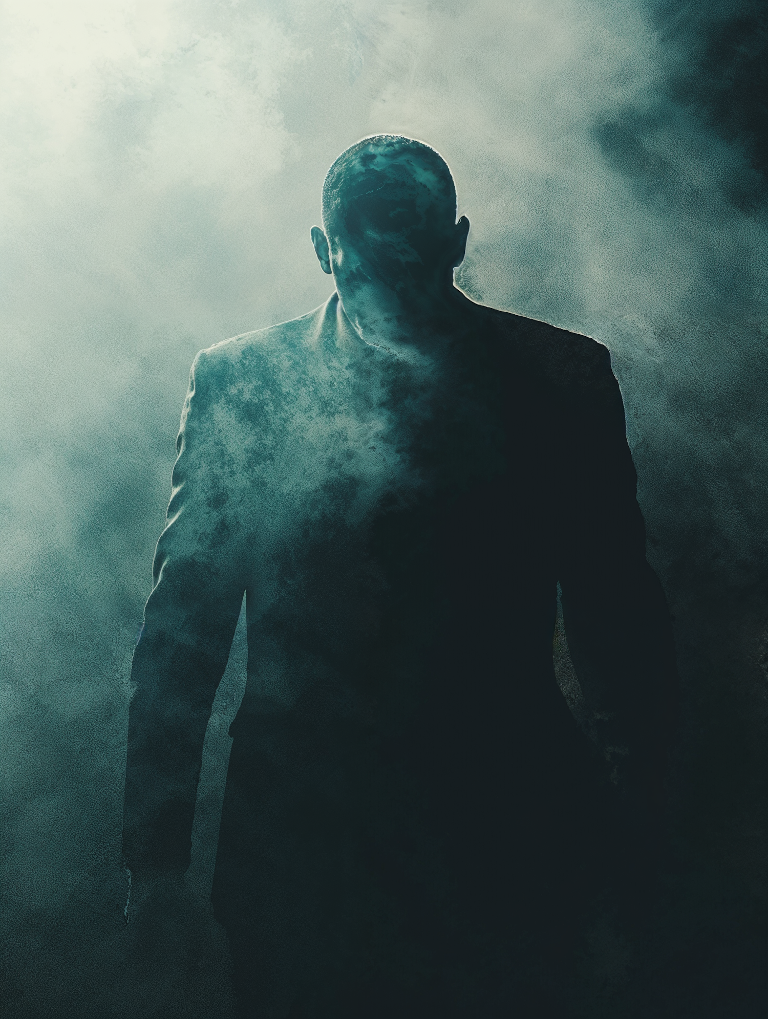 A mysterious silhouette in a suit emerges from dense greenish mist, creating an eerie and suspenseful atmosphere.