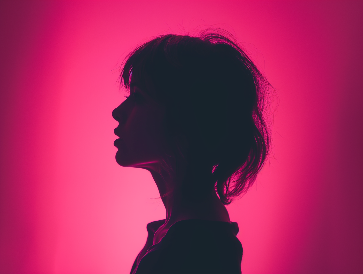 Silhouette of a person with tousled hair against a vibrant pink background, creating a striking contrast.