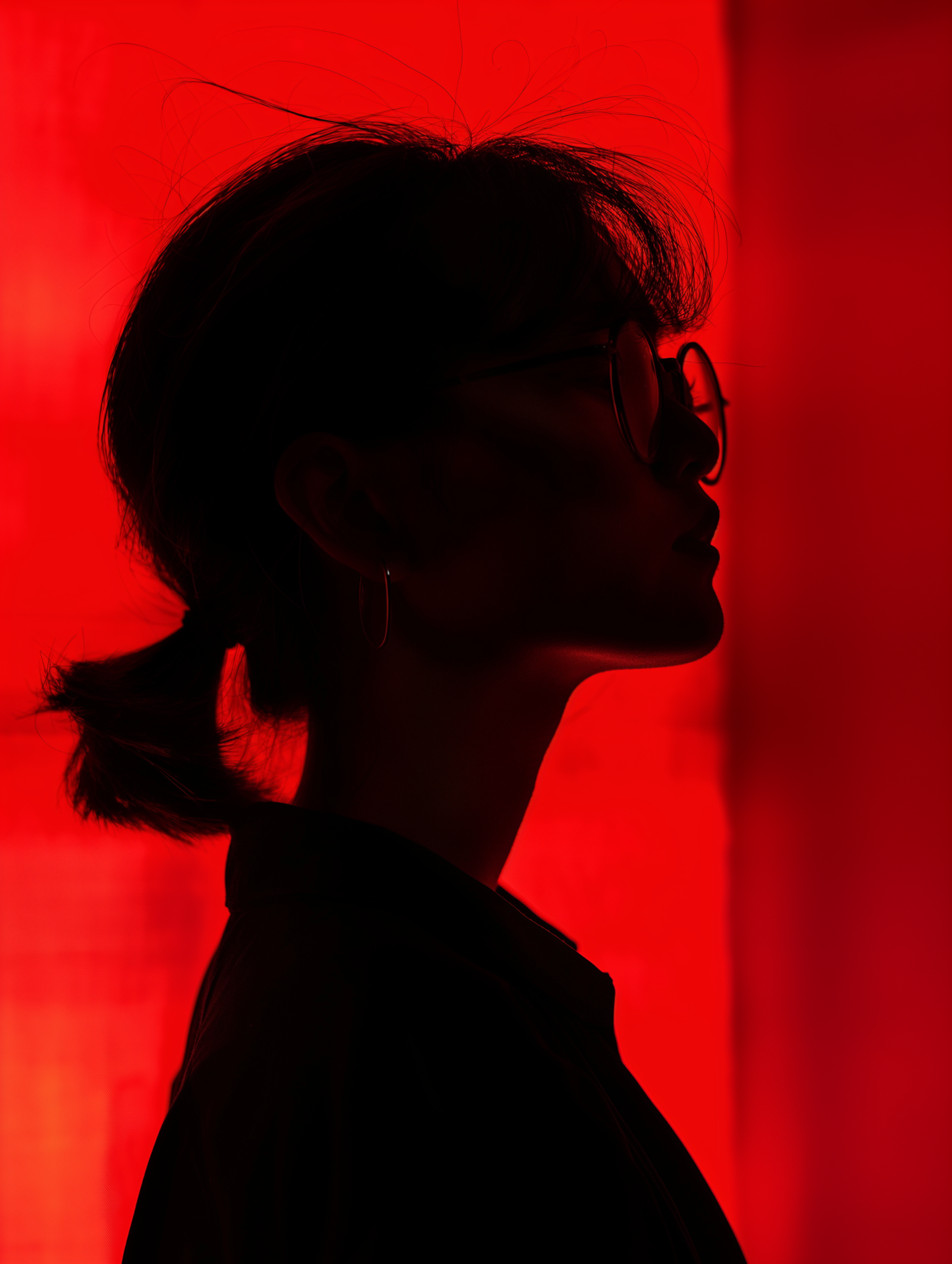 Silhouette of a person with glasses against a vivid red background, creating a dramatic and striking contrast.