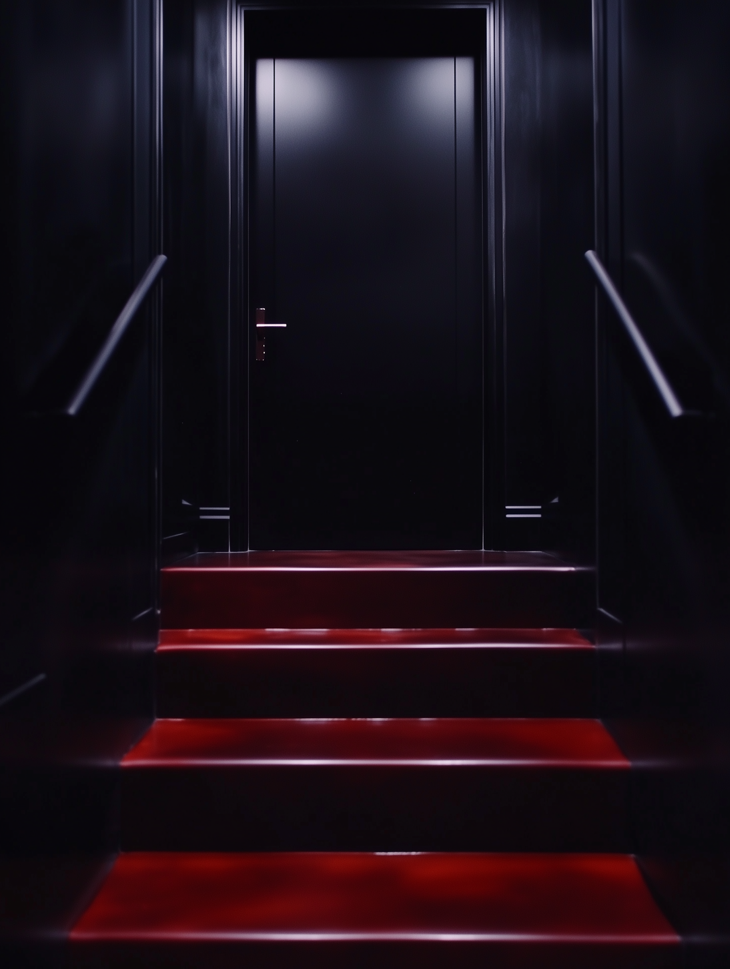 A dramatic staircase with glowing red steps leading to a sleek black door, creating a mysterious and suspenseful atmosphere.