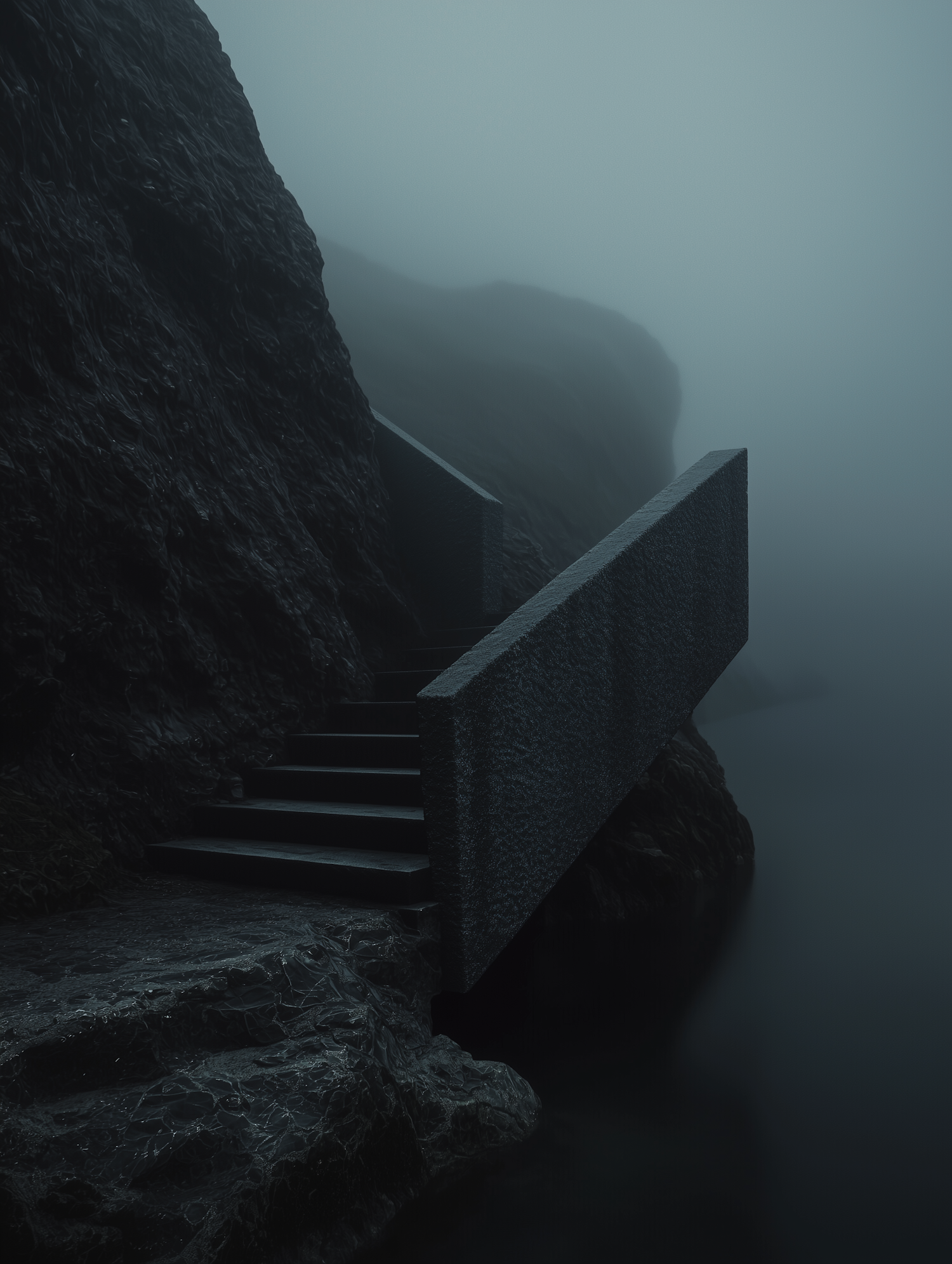 Mysterious stone stairs ascend a foggy cliff, enveloped in mist. Dark, moody atmosphere with rugged textures and muted colors.