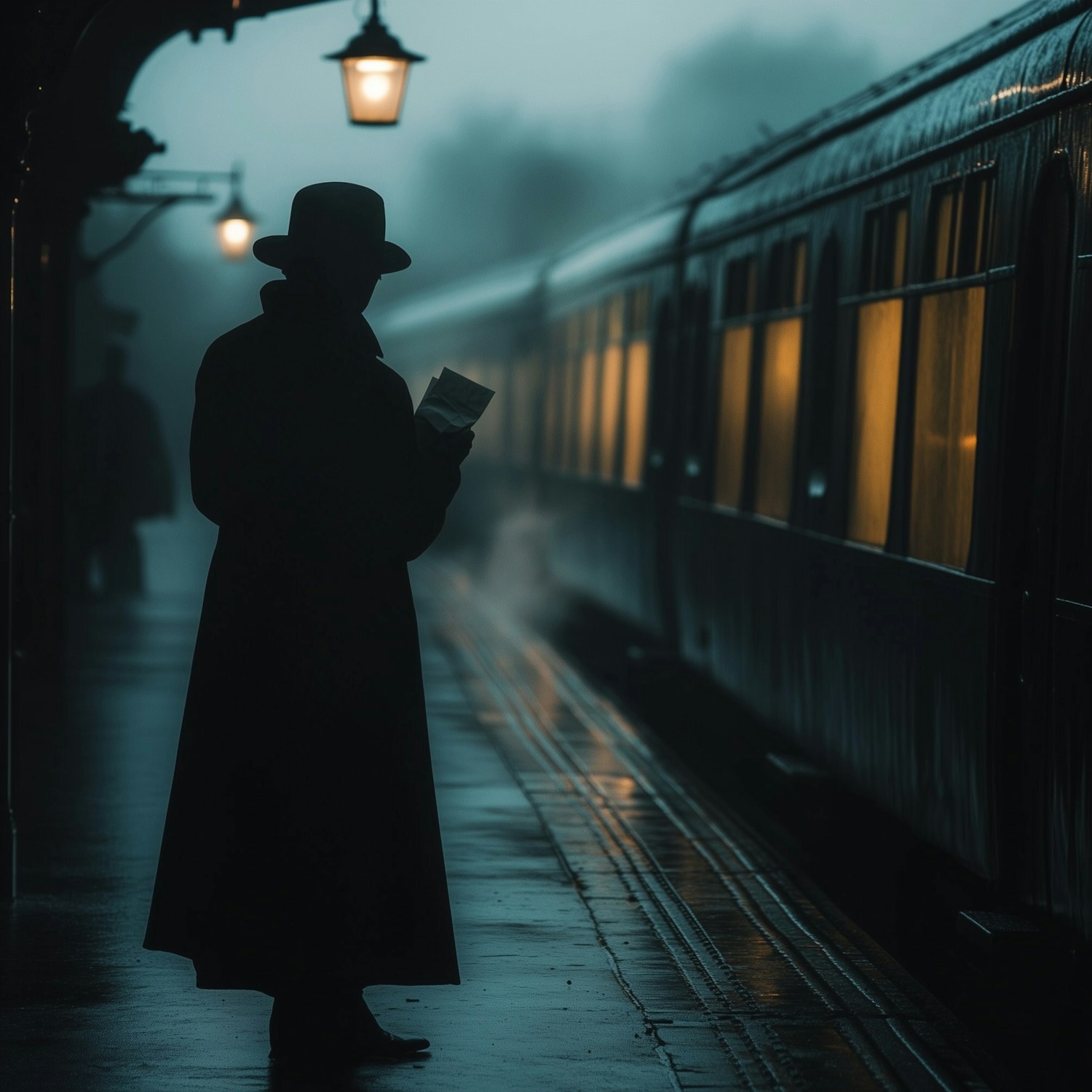A mysterious figure in a hat and coat stands on a foggy train platform, holding a paper, with a vintage train glowing warmly in the background.