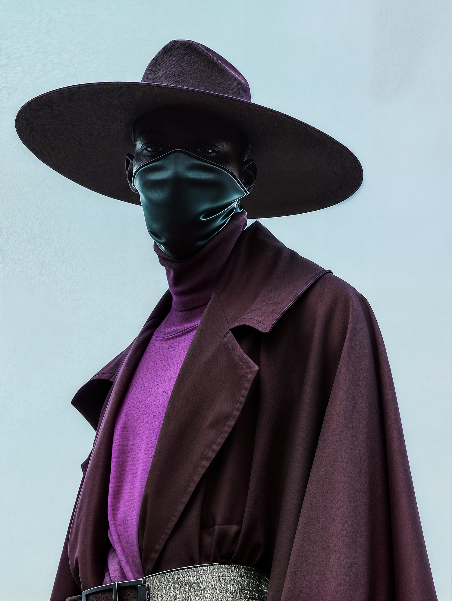 Stylish individual in a wide-brimmed hat, purple coat, and face mask against a muted blue background.