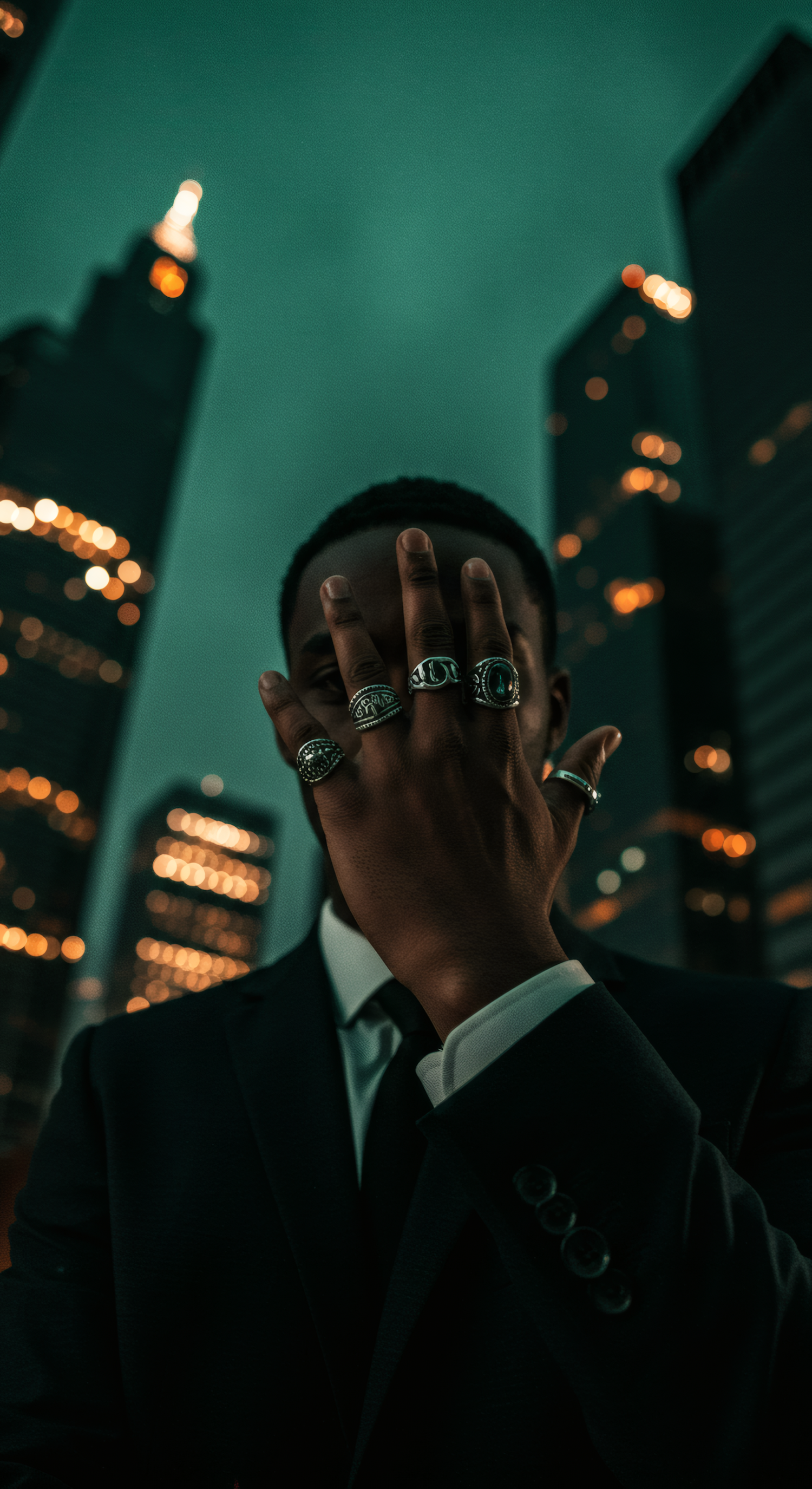Man in a suit covers face with ring-adorned hand against a cityscape backdrop, creating a mysterious urban vibe.