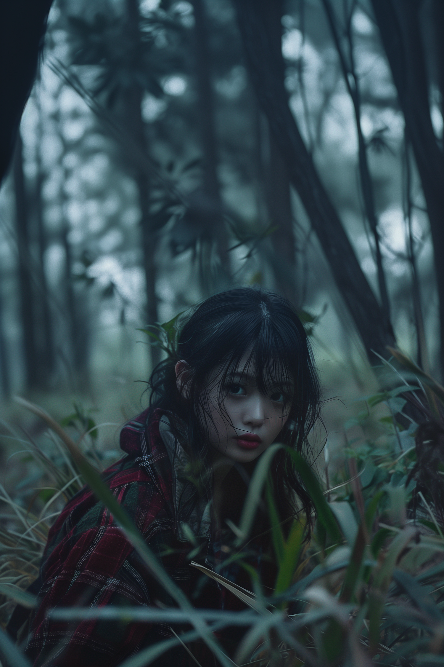 A young woman in a red plaid shirt crouches in a misty forest, surrounded by dense foliage, creating a mysterious atmosphere.