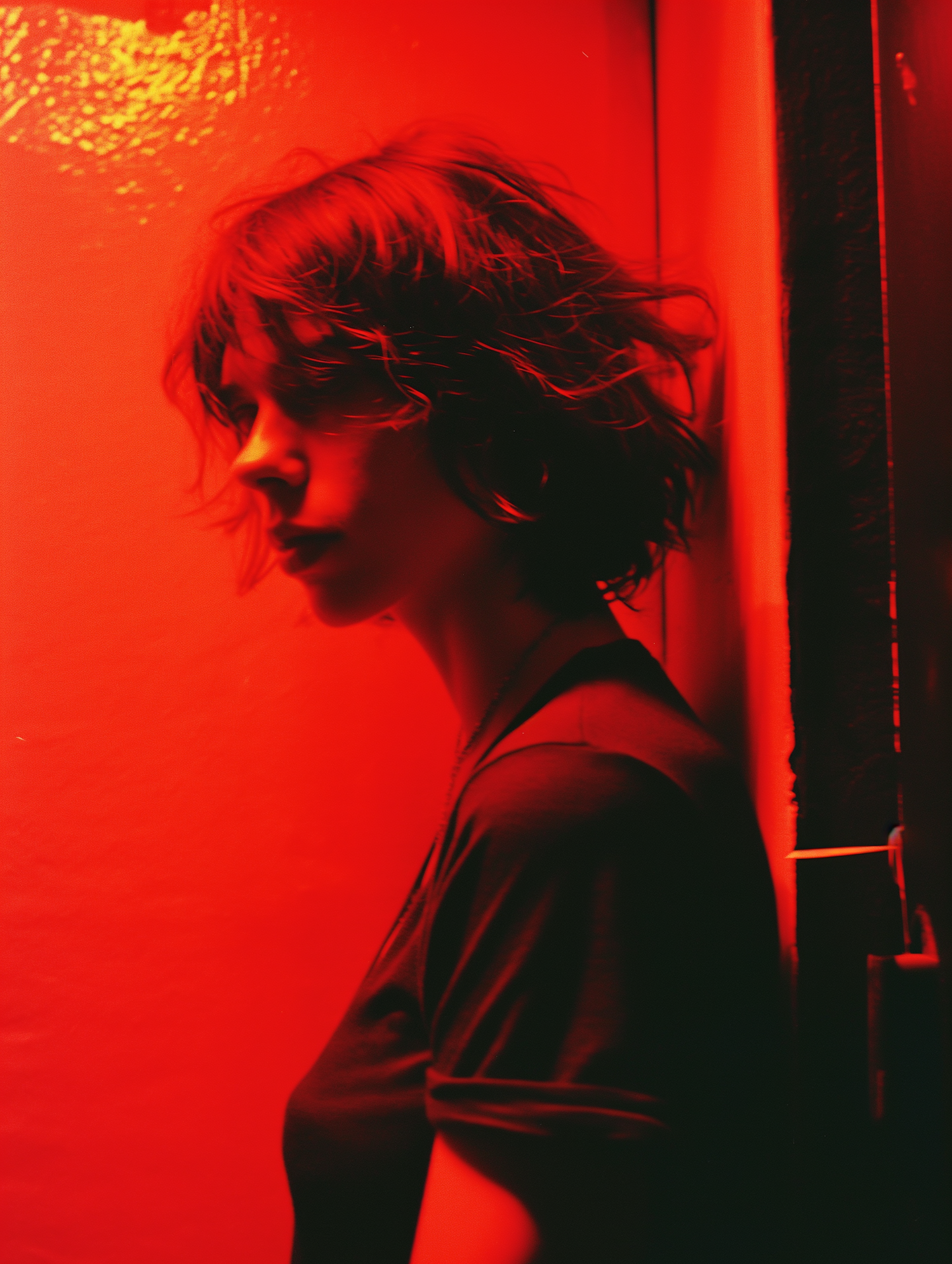 Person in profile with tousled hair, bathed in dramatic red light, creating a moody and intense atmosphere.