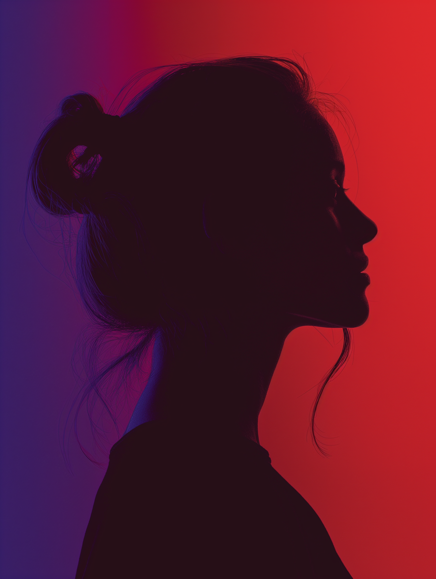Silhouette of a woman with a bun against a vibrant blue to red gradient background, highlighting her profile.