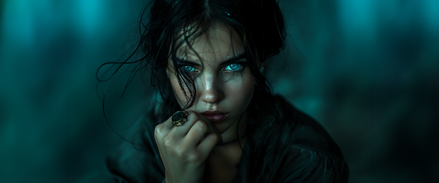 Intense portrait of a young woman with striking blue eyes and wet hair, set against a moody teal background.