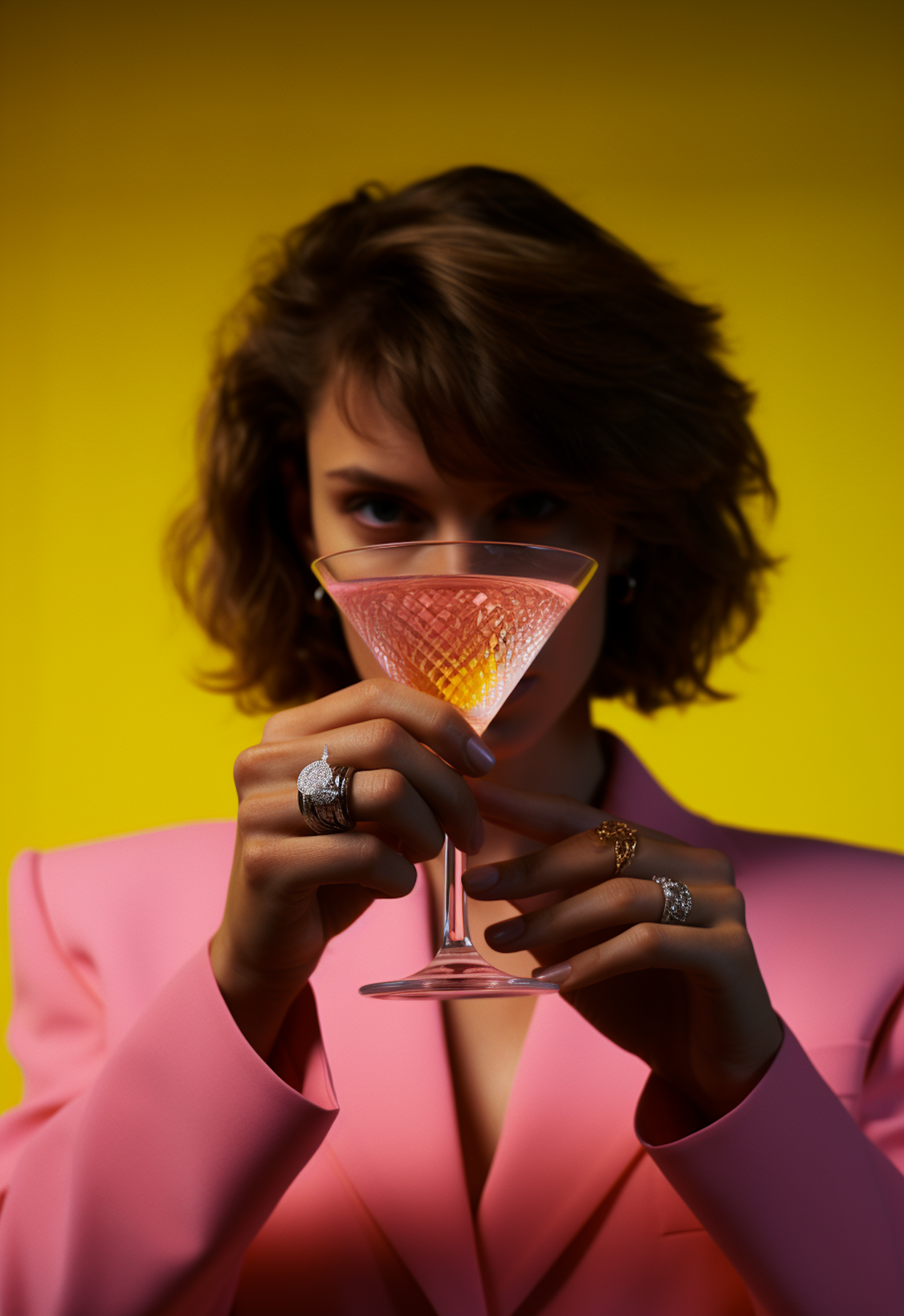 Woman in pink blazer holding a pink cocktail against a vibrant yellow background, showcasing elegant rings and a stylish look.