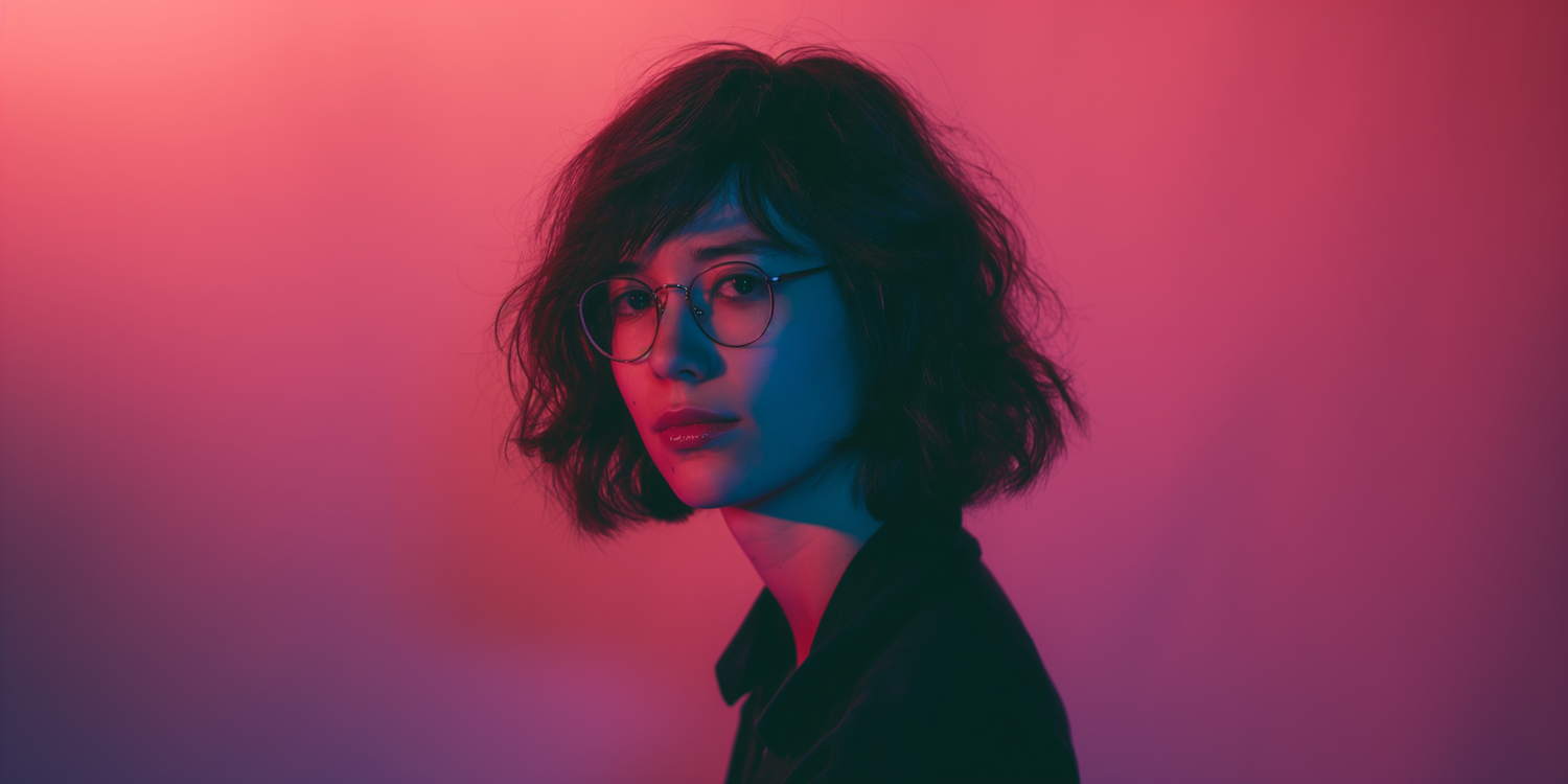 Portrait of a young woman with glasses in dramatic pink and blue lighting, creating a moody and artistic atmosphere.