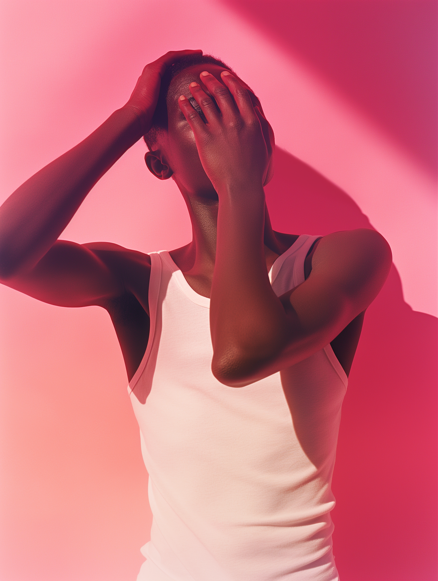 Artistic portrait of a person in a white tank top against a pink background, with dramatic lighting and expressive pose.