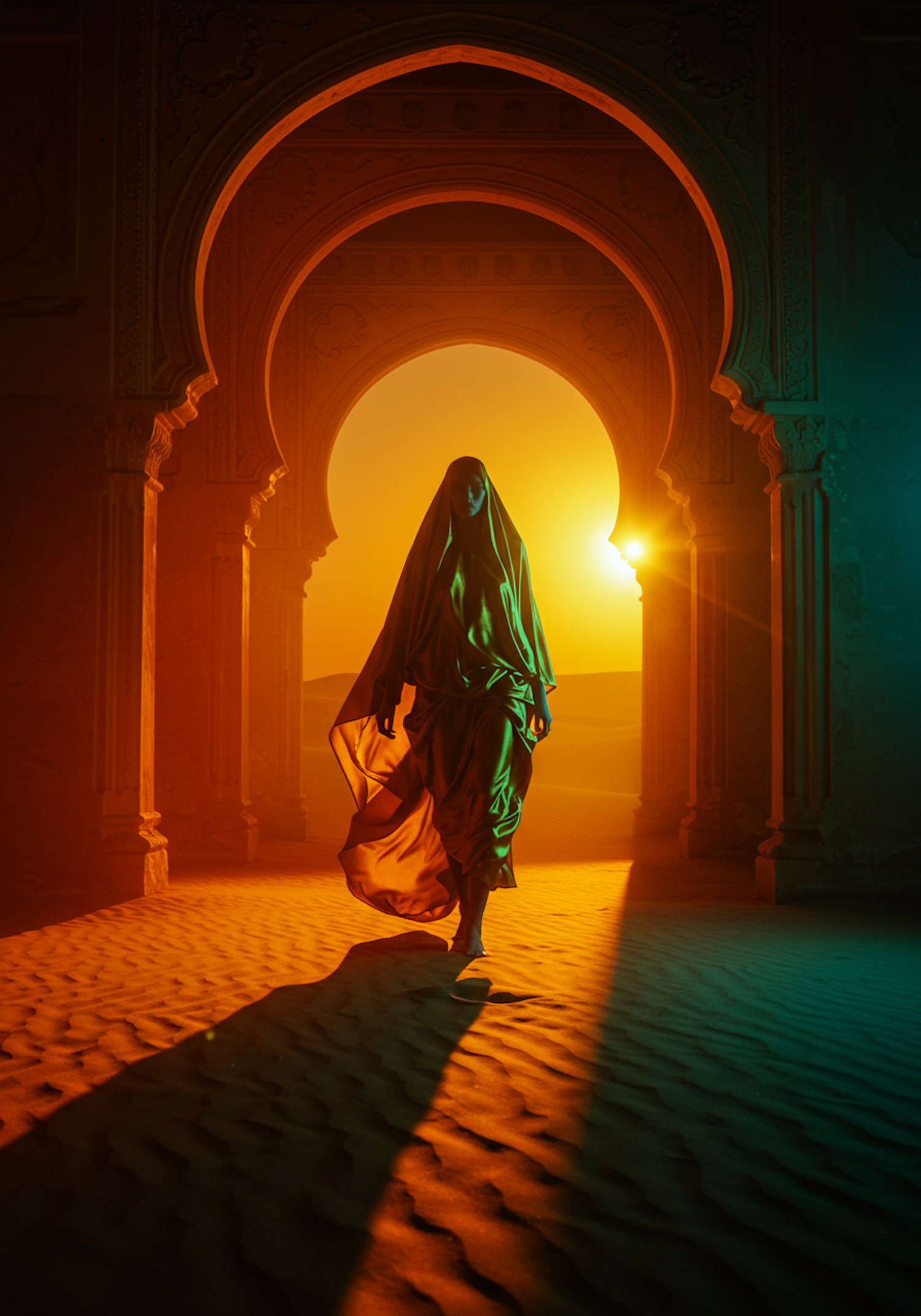 A mysterious figure in green robes walks through a desert archway at sunset, with dramatic orange and green lighting creating a surreal vibe.