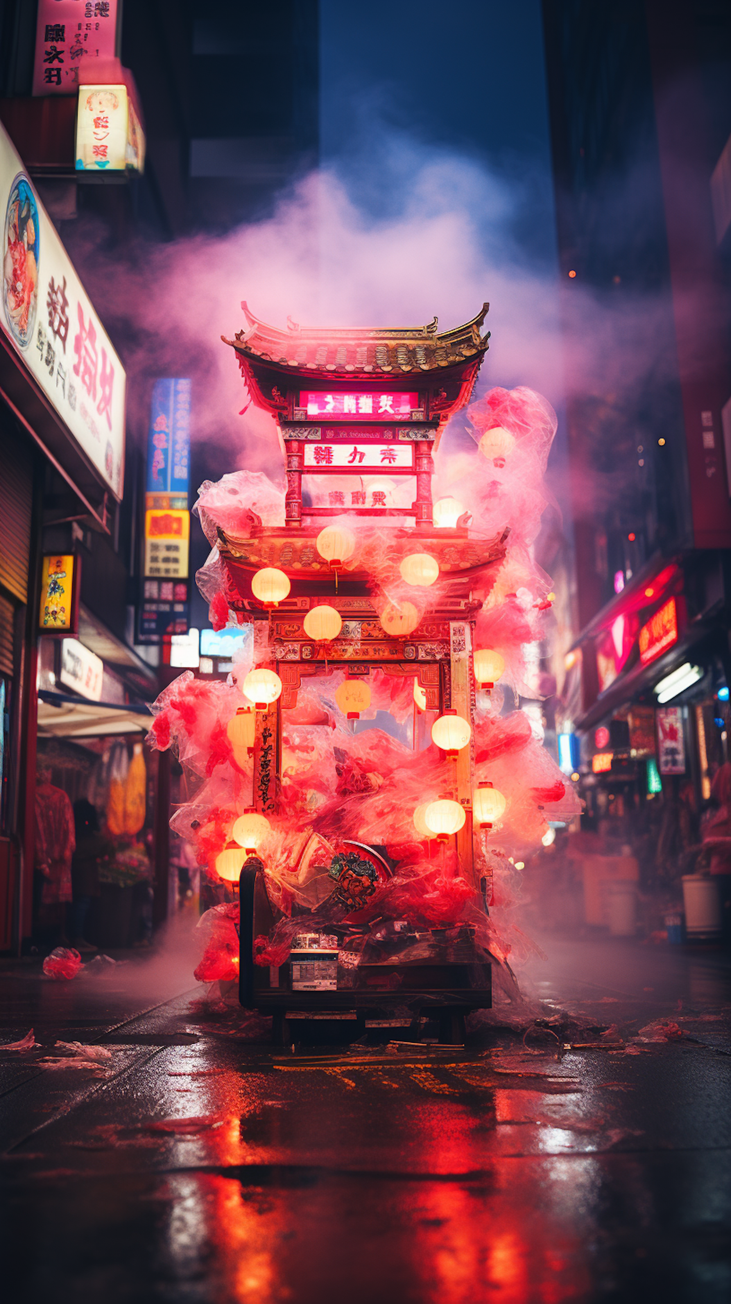 Vibrant night scene with a traditional Chinese cart, glowing lanterns, and pink smoke in a bustling urban setting.