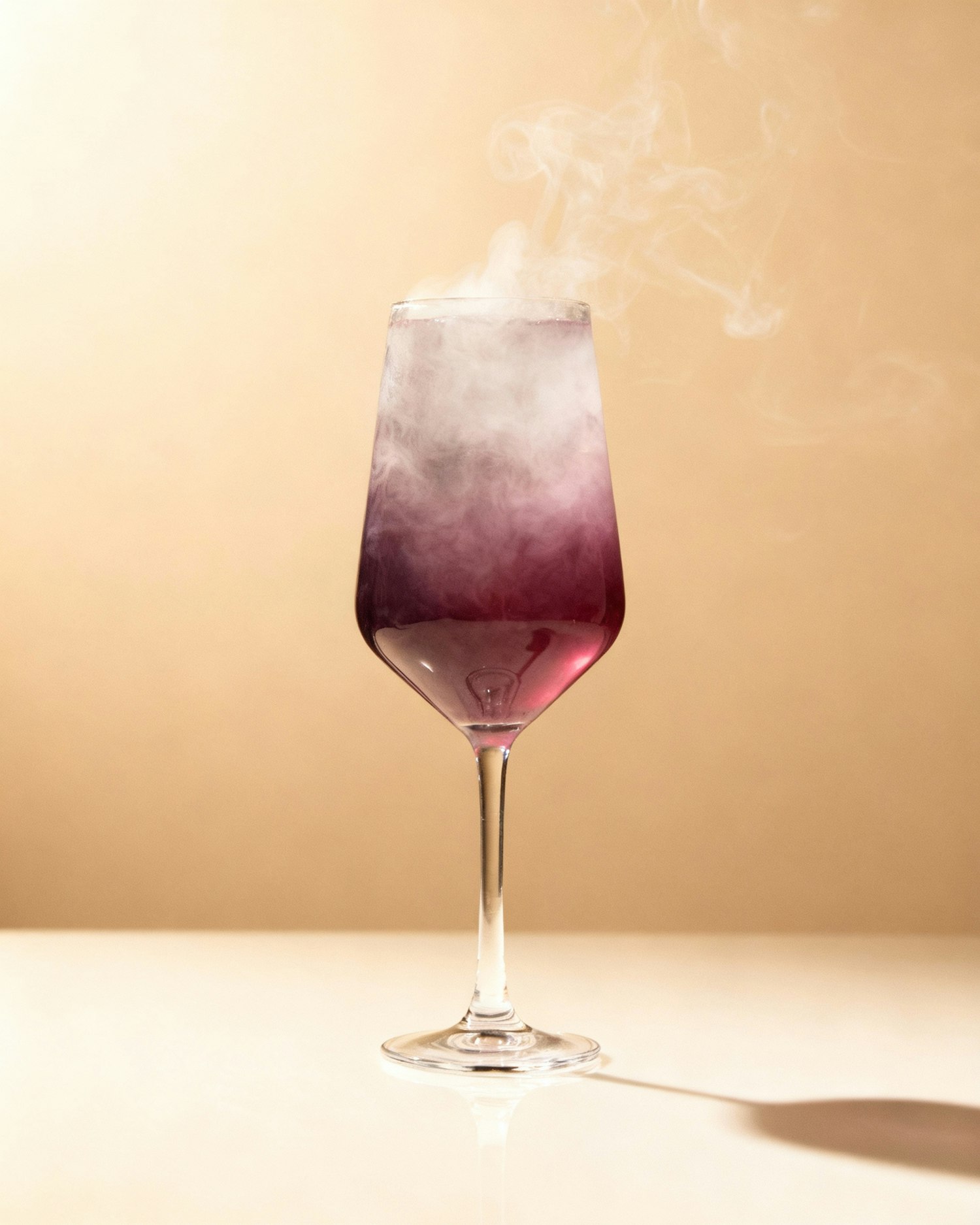 A glass of purple liquid emitting vapor, set against a beige background, creating a mysterious and elegant atmosphere.