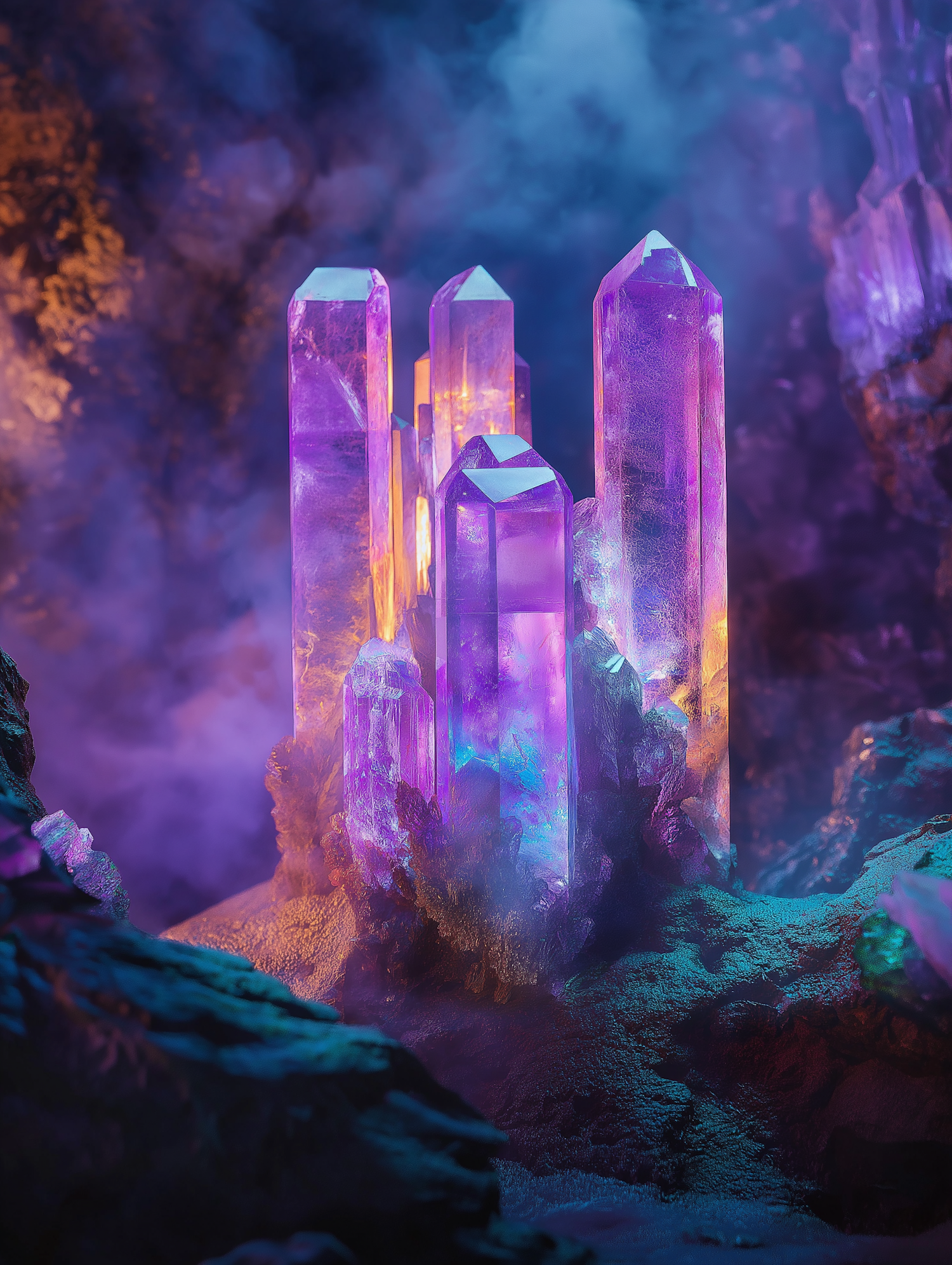 Glowing purple and orange crystals in a misty, ethereal setting with textured rocks and a mystical foggy atmosphere.