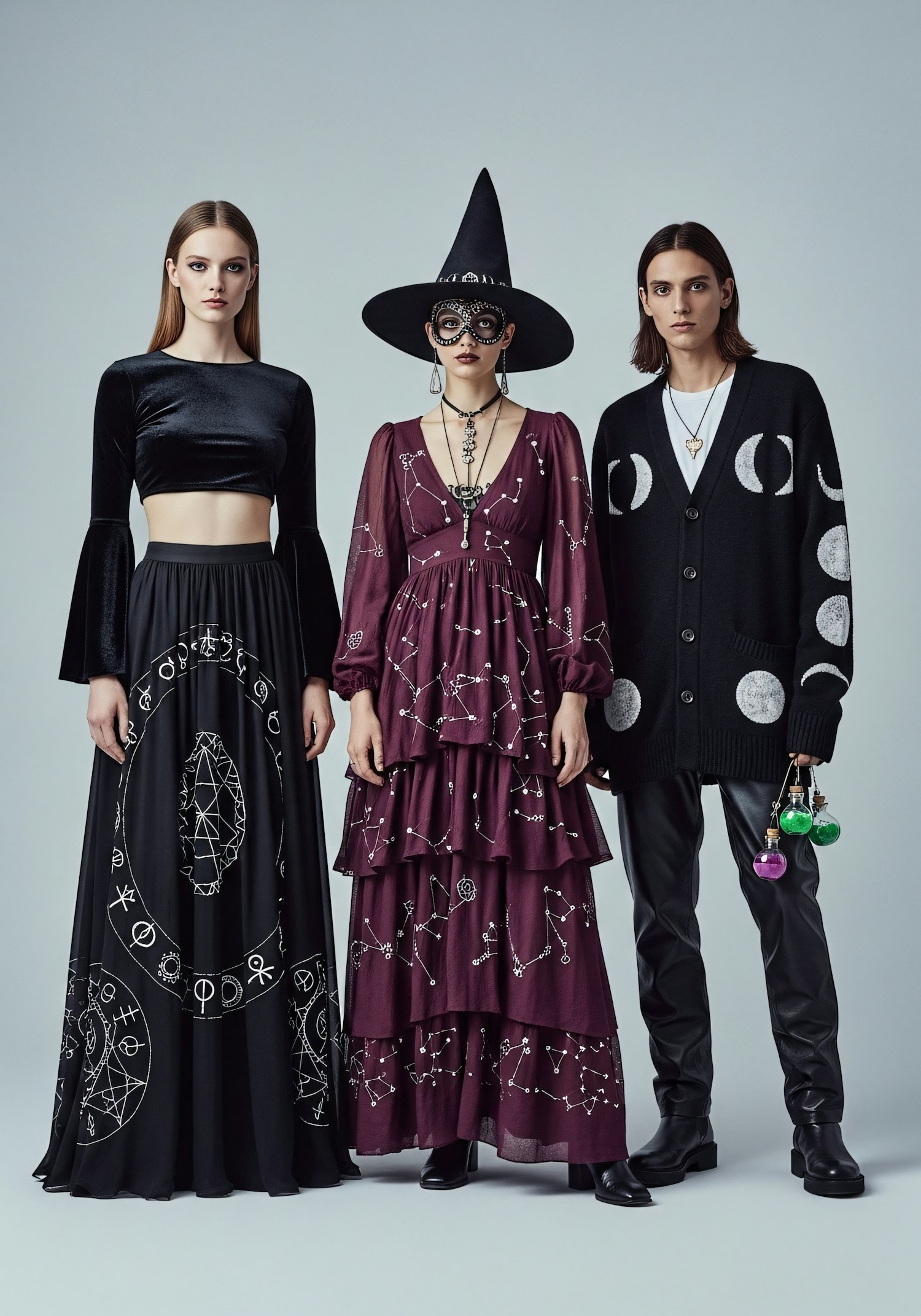Three individuals in mystical-themed outfits featuring celestial and occult designs, including a witch hat, moon phases, and constellation patterns.