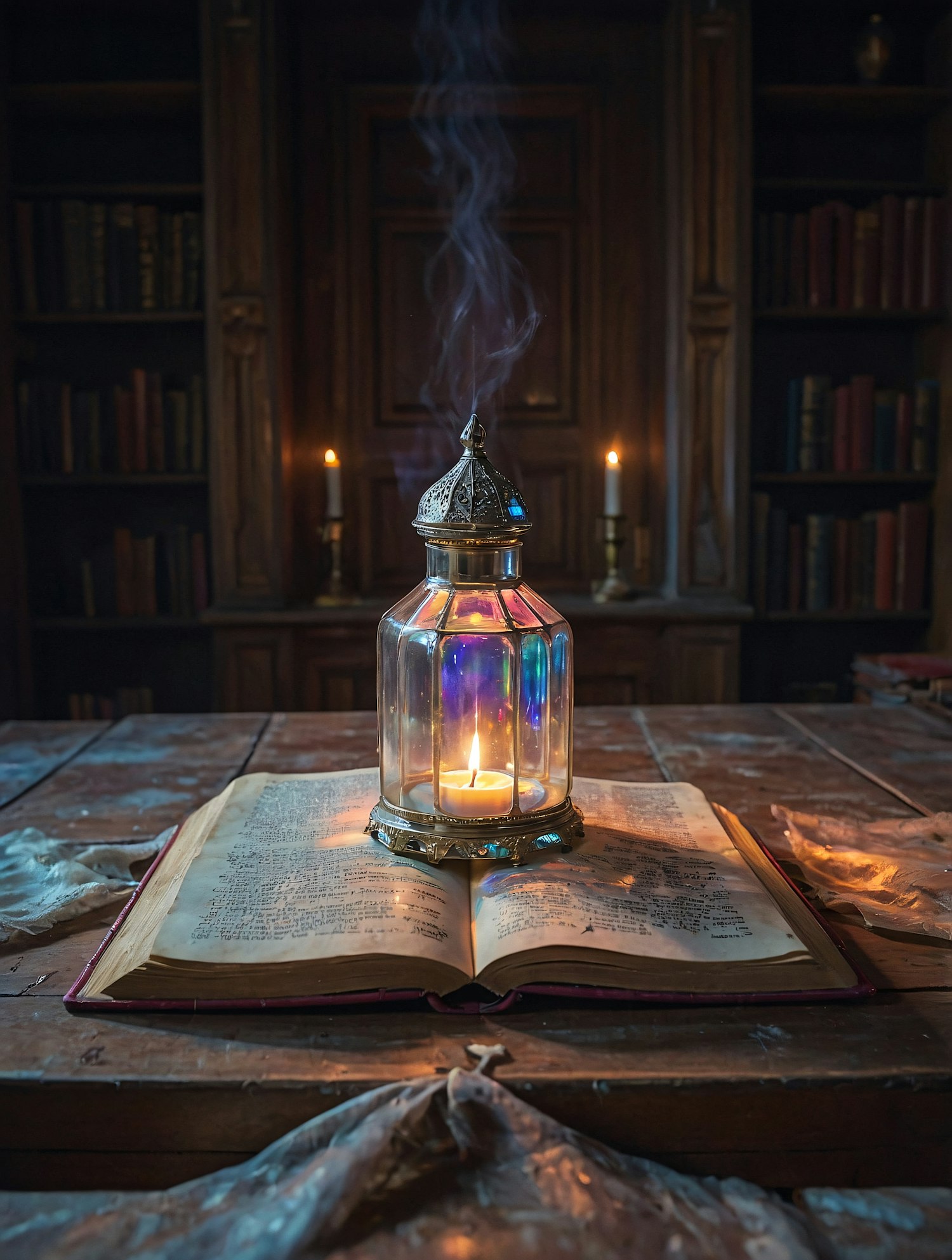 A mystical scene with an open book and a glowing lantern on a dusty table, surrounded by candlelight in an antique library.