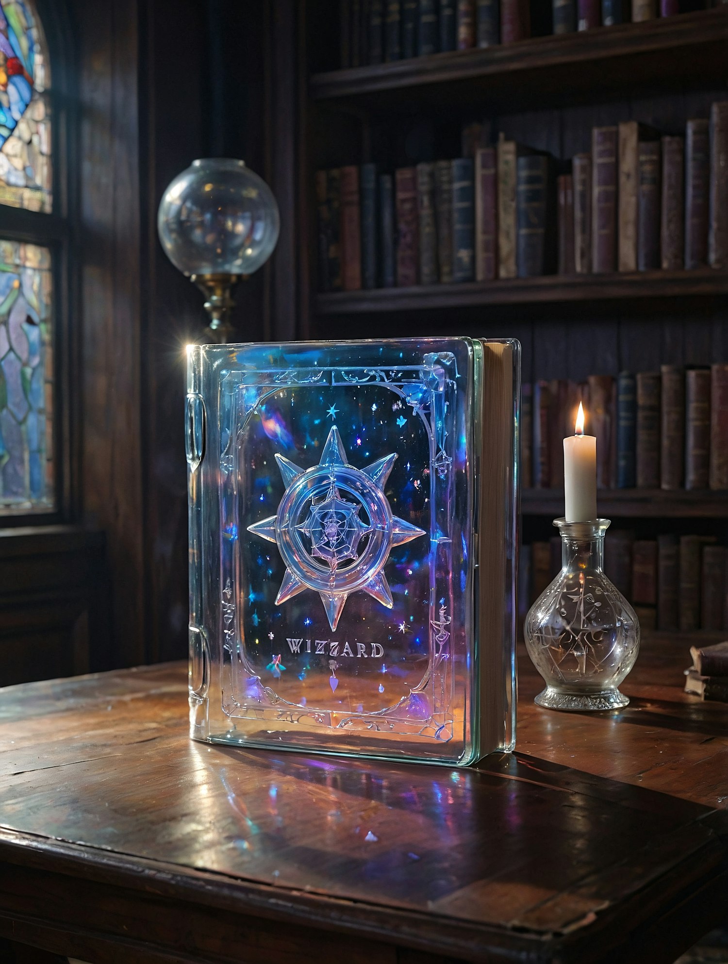 A glowing magical book titled 'WIZZARD' on a wooden table, surrounded by candlelight and old books in a mystical library.