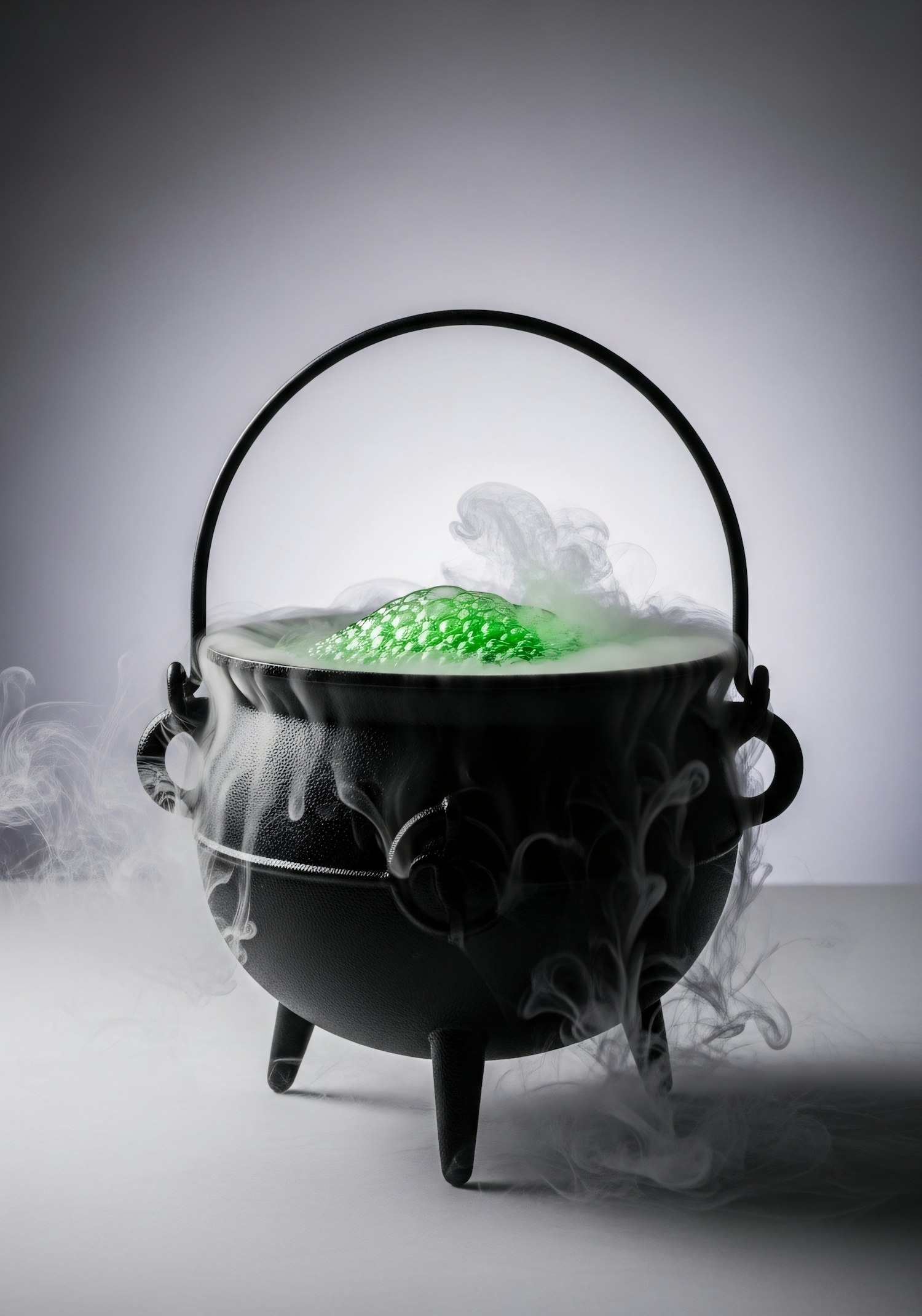 A black cauldron with bubbling green liquid and mist, creating a mystical and eerie atmosphere against a gray background.