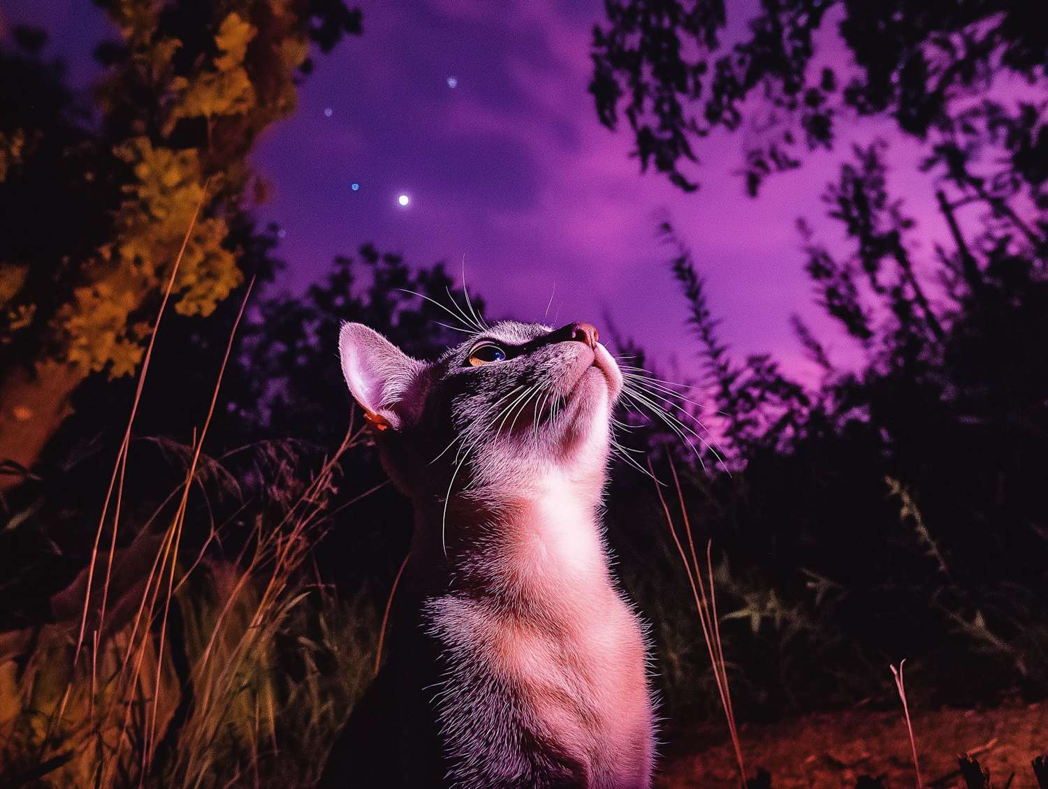 Cat gazing at a starry purple night sky, surrounded by silhouetted trees and grass, creating a magical and serene scene.