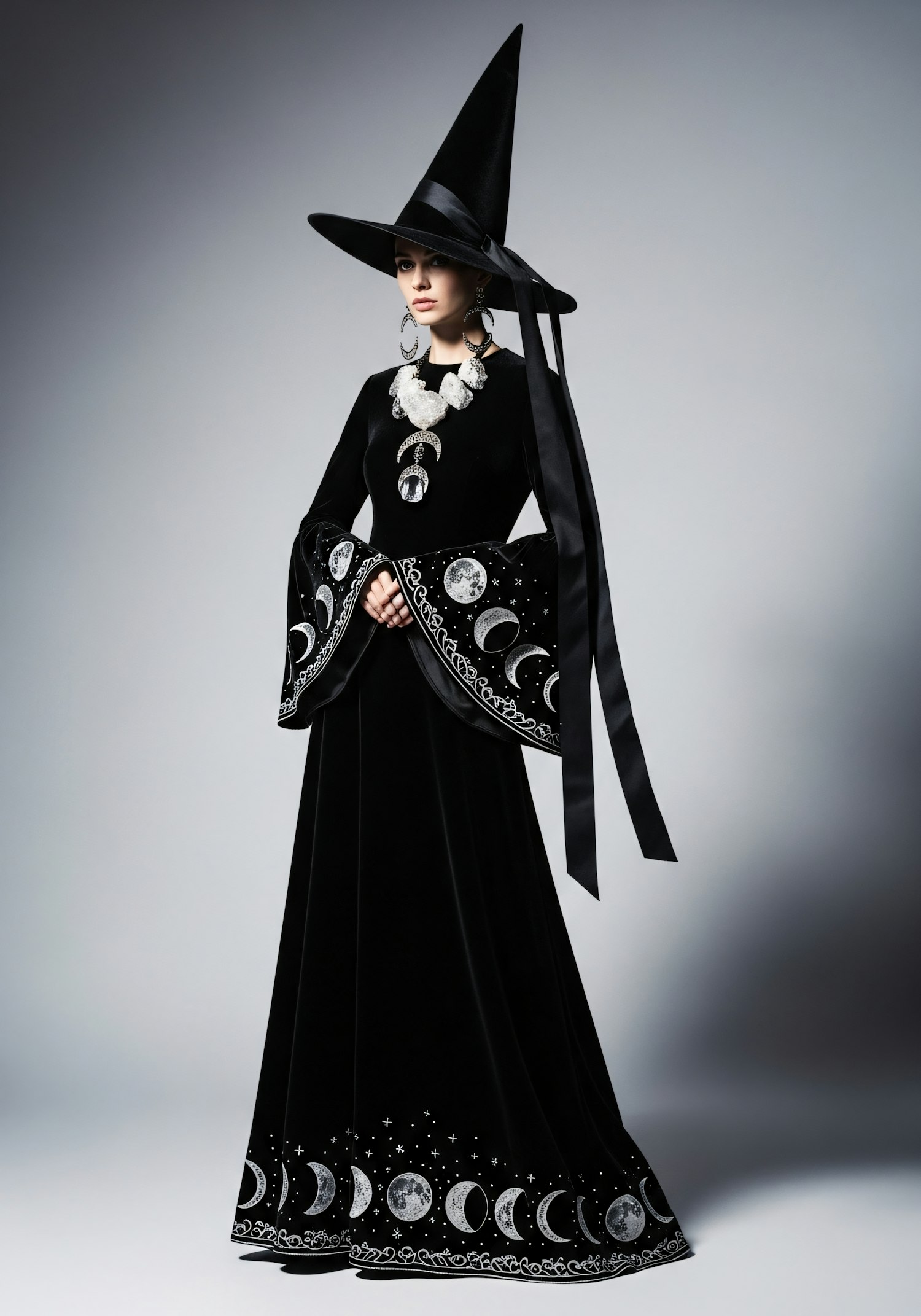 A woman in a celestial-themed black gown with a pointed hat and moon-inspired jewelry, exuding a mystical and elegant vibe.