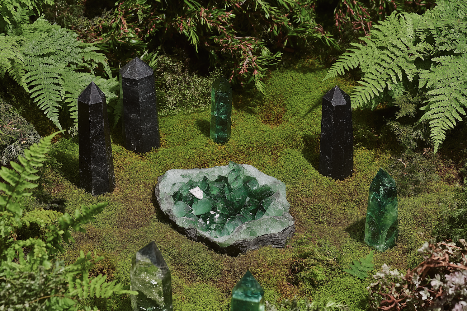 A stunning arrangement of green crystals, highlighted by dark obelisks and green emerald-like stones, set amidst rich, leafy moss and ferns.