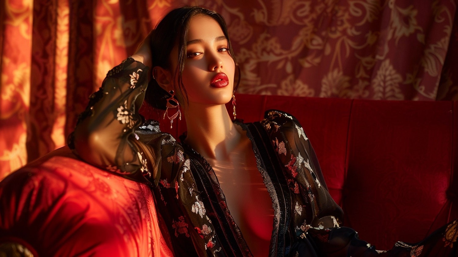Elegant woman in a sheer black embroidered dress on a red sofa, exuding confidence and style in warm, luxurious lighting.