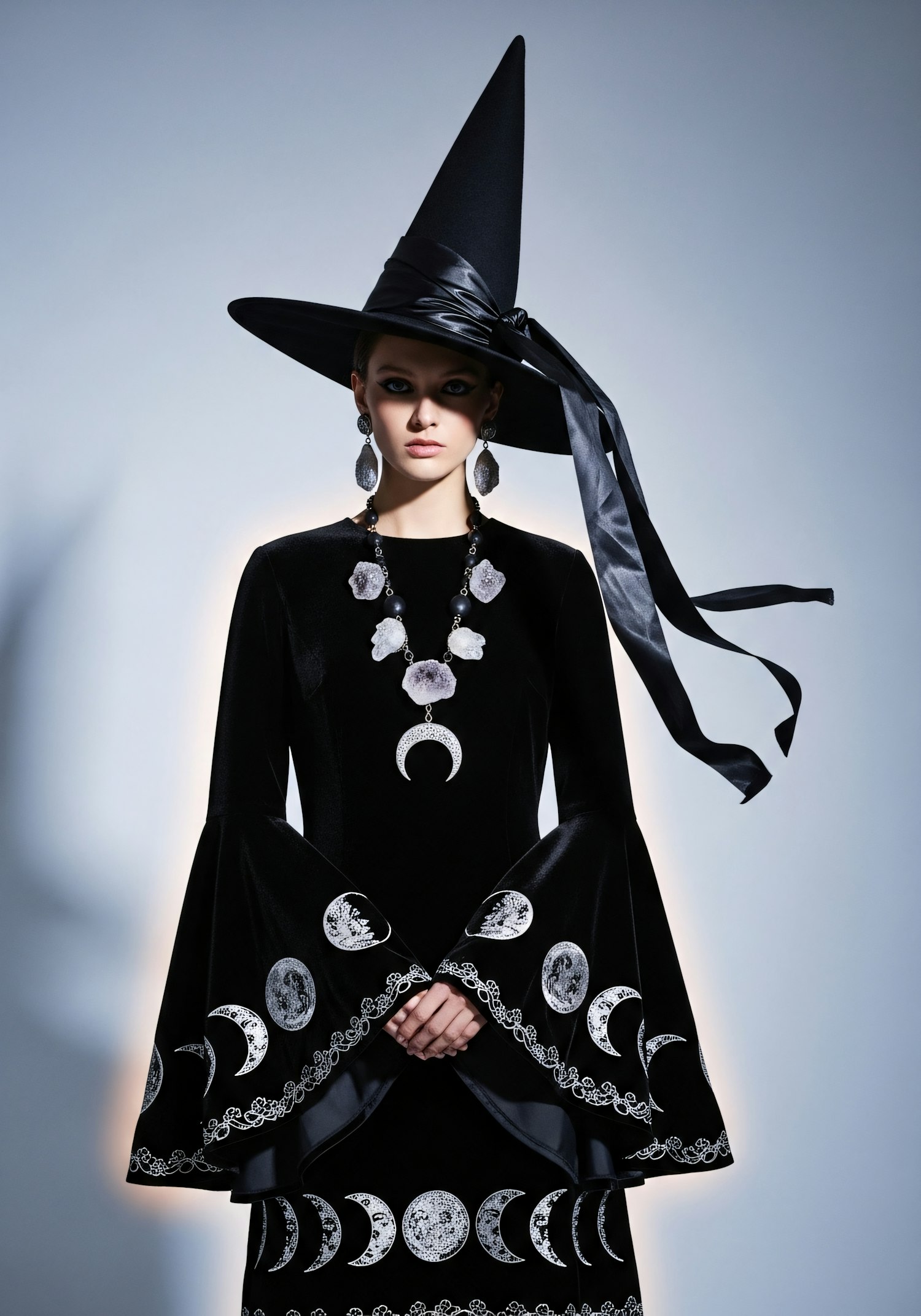 A woman in a black celestial-themed outfit with a pointed hat and moon motifs, exuding a mystical and elegant vibe.