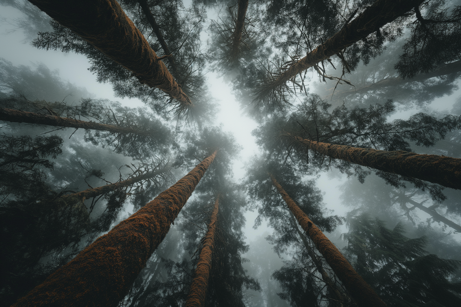 Misty forest view from below, showcasing tall trees with moss-covered trunks reaching into a foggy sky.