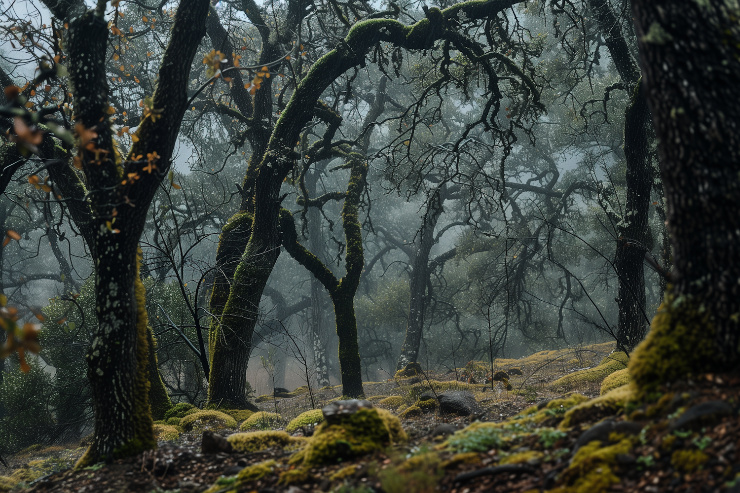 Misty forest with gnarled trees and moss-covered ground, creating a serene and mysterious atmosphere.
