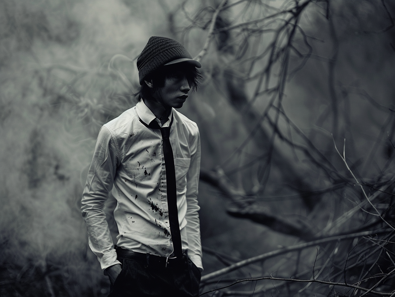 Moody portrait of a young man in a misty forest, wearing a beanie and stained shirt, surrounded by fog and bare branches.