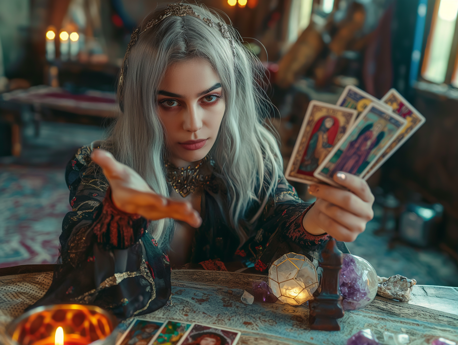 Mystical scene with a woman reading tarot cards, surrounded by crystals and candlelight, creating an enchanting atmosphere.