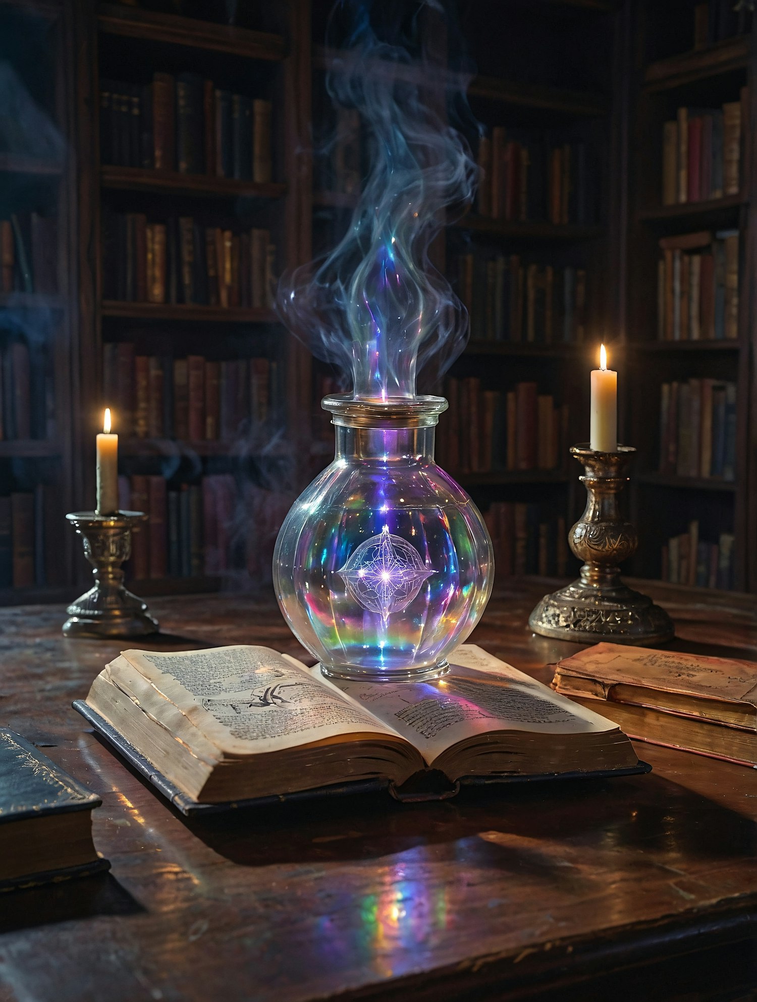 A mystical glass orb emits colorful lights and smoke in a dimly lit library, surrounded by ancient books and glowing candles.