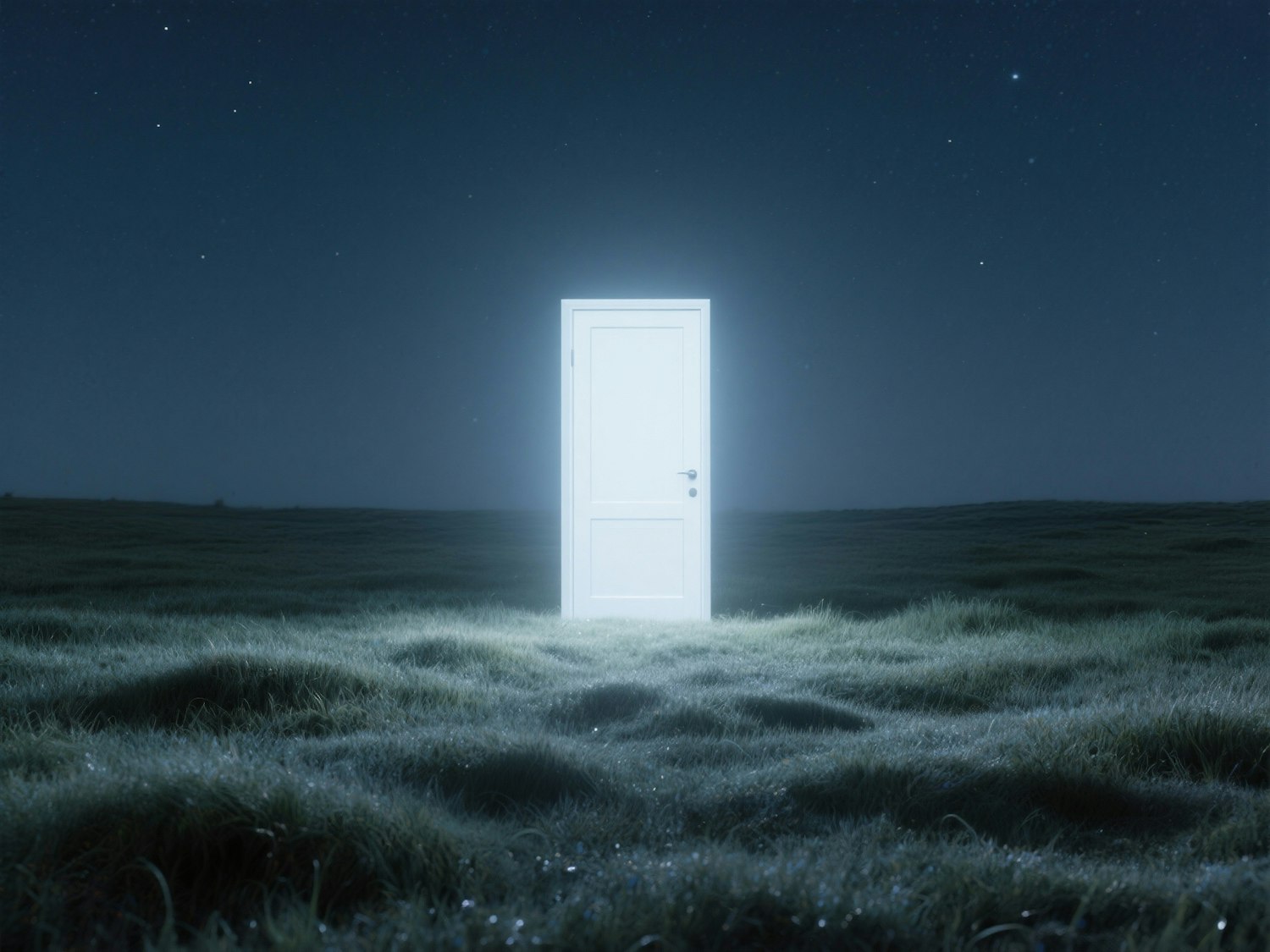 A glowing white door in a grassy field under a starry night sky, creating a mysterious and surreal atmosphere.