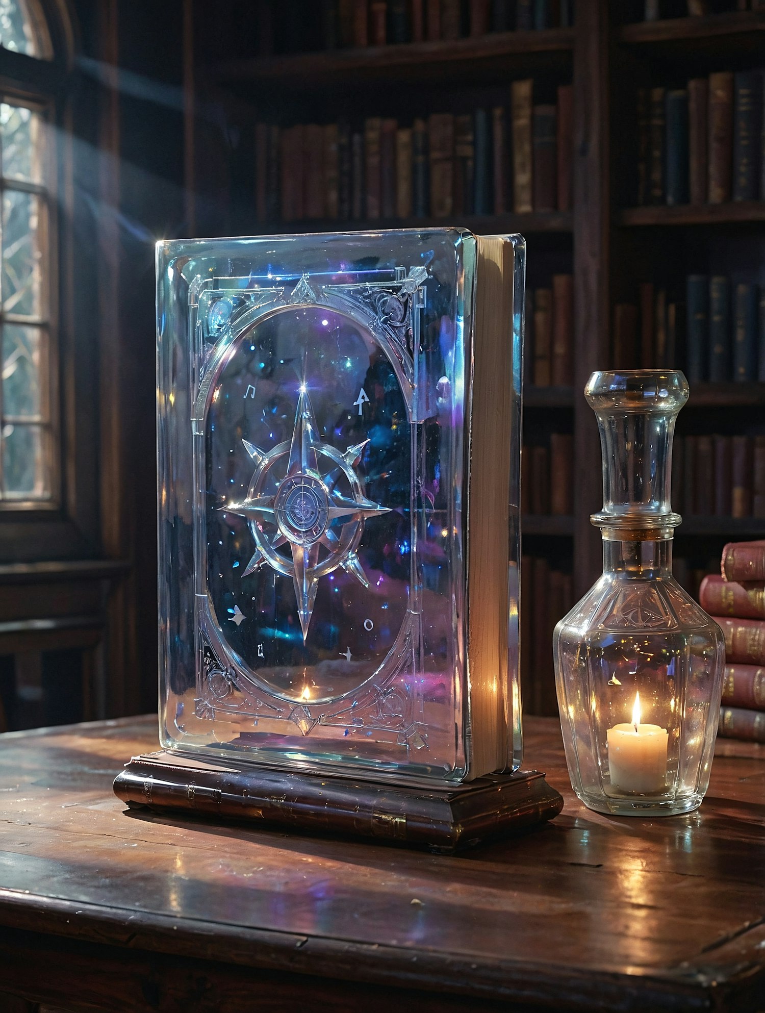 A mystical book with a celestial design and a lit candle on a wooden table, surrounded by shelves of old books in warm sunlight.