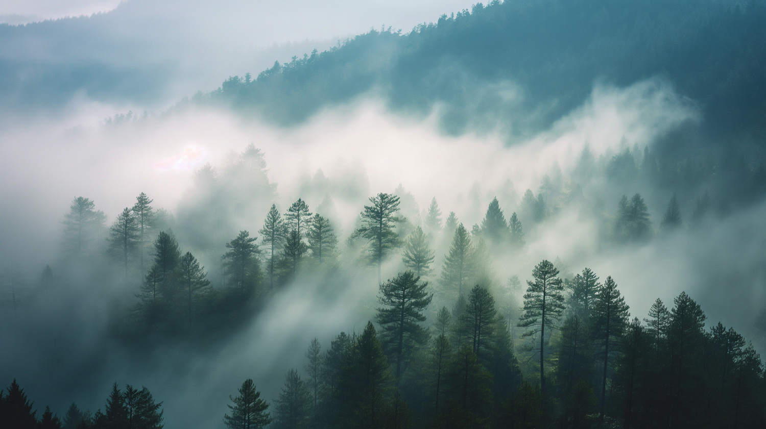 Misty forest landscape with tall pine trees and ethereal fog, creating a serene and mystical atmosphere.