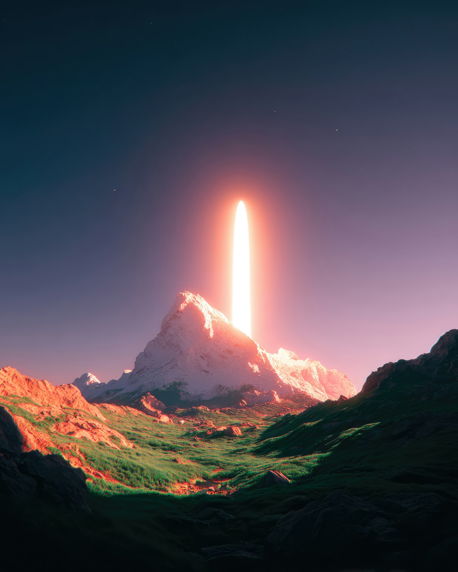 A glowing beam of light emerges from a snowy mountain peak, illuminating a lush green valley under a gradient sky.