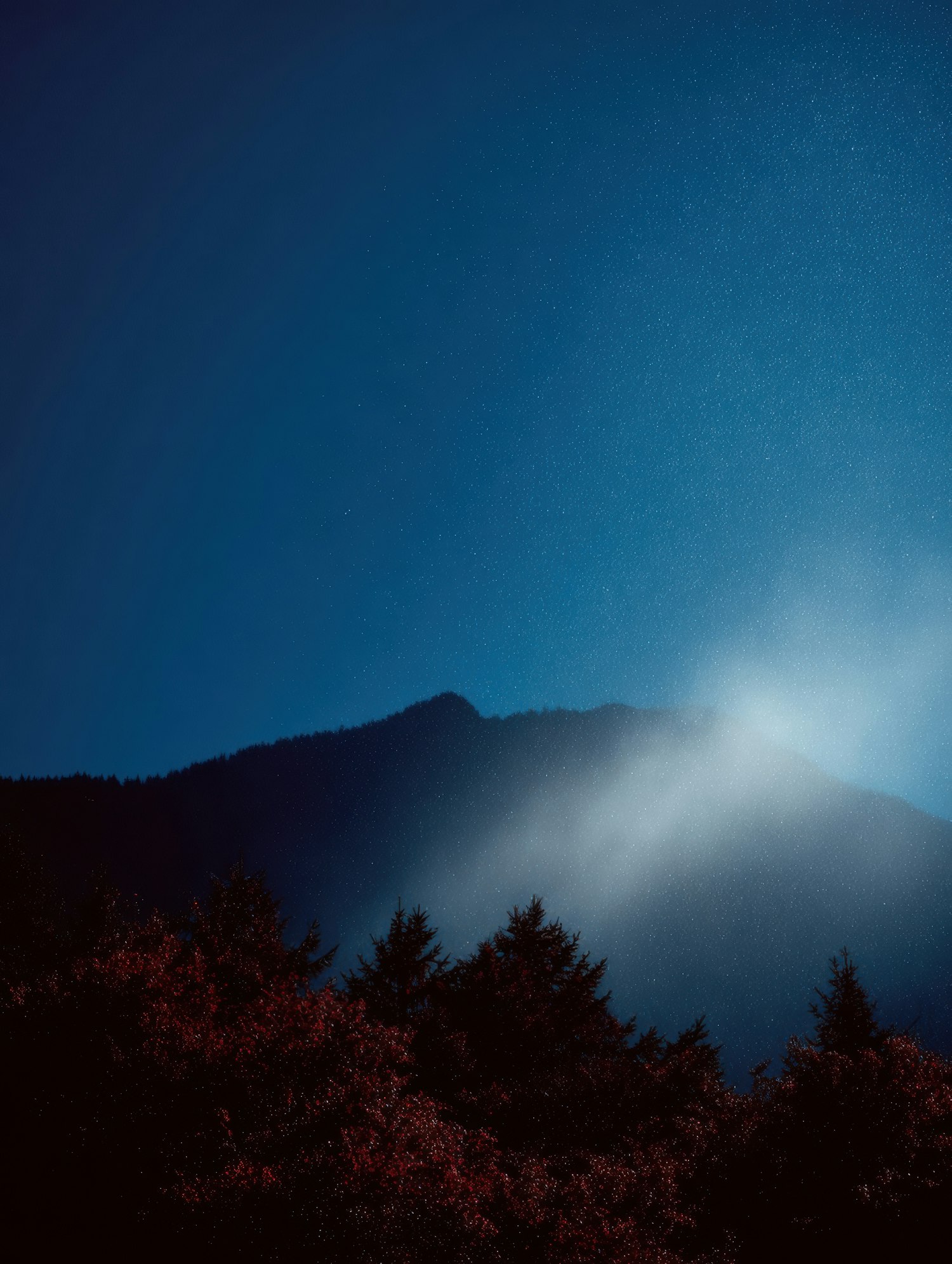 A tranquil mountain silhouette under a starry night sky, with misty light and reddish-tinged trees creating a serene, mystical vibe.