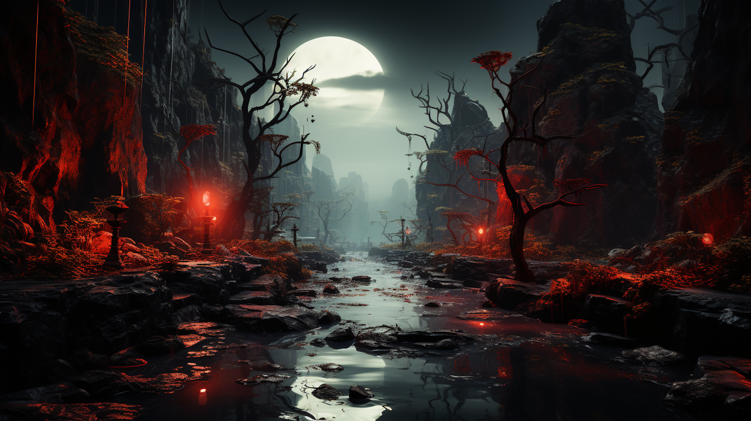 Mystical landscape with a full moon, jagged cliffs, a winding river, and eerie red lanterns casting a crimson glow.