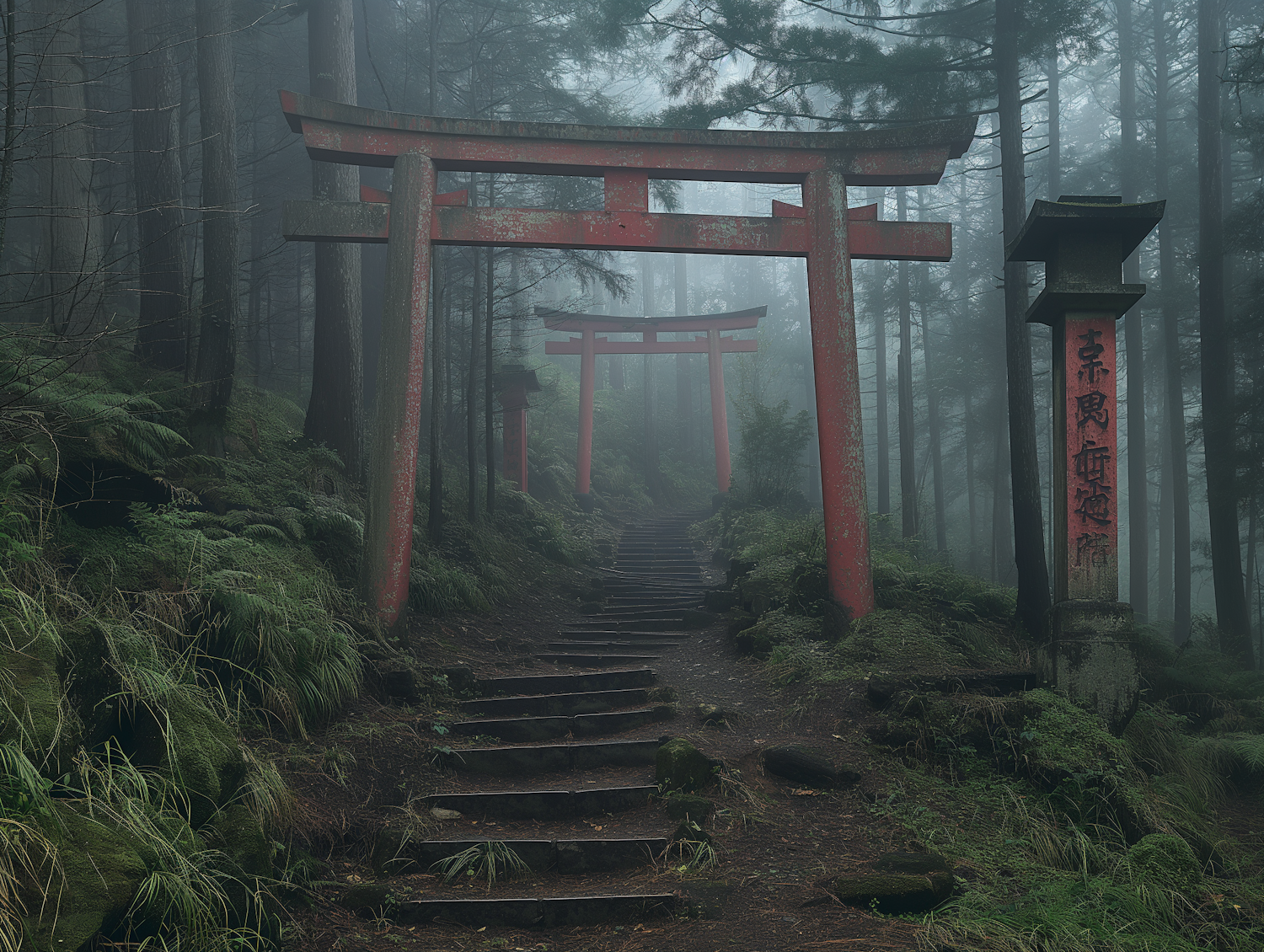 Misty forest path with red torii gates and lush greenery, creating a serene and mystical atmosphere.